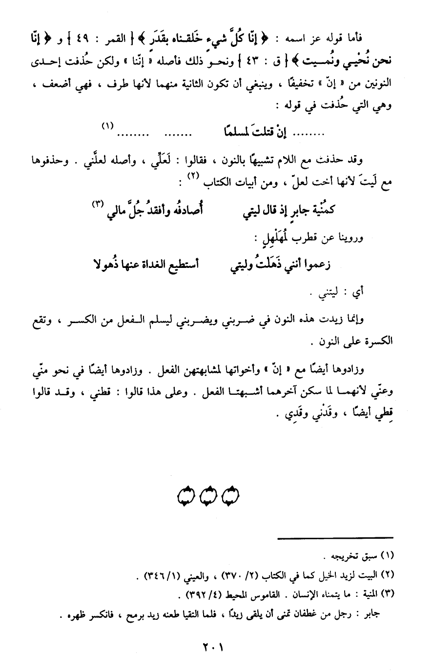 فأما قوله عَزَّ اسْمُهُ: {إِنَّا كُلَّ شَيْءٍ خَلَقْنَاهُ بِقَدَرٍ} [القمر: 49] و {إِنَّا نَحْنُ نُحْيِي وَنُمِيتُ} [ق: 43] ونحو ذلك فأصله "إنّنا" ولكن حذفت إحدى النونين من "إنّ" تخفيفًا، وينبغي أن تكون الثانية منها لأنها طرف، فهي أضعف، وهي التي حذفت في قوله:
