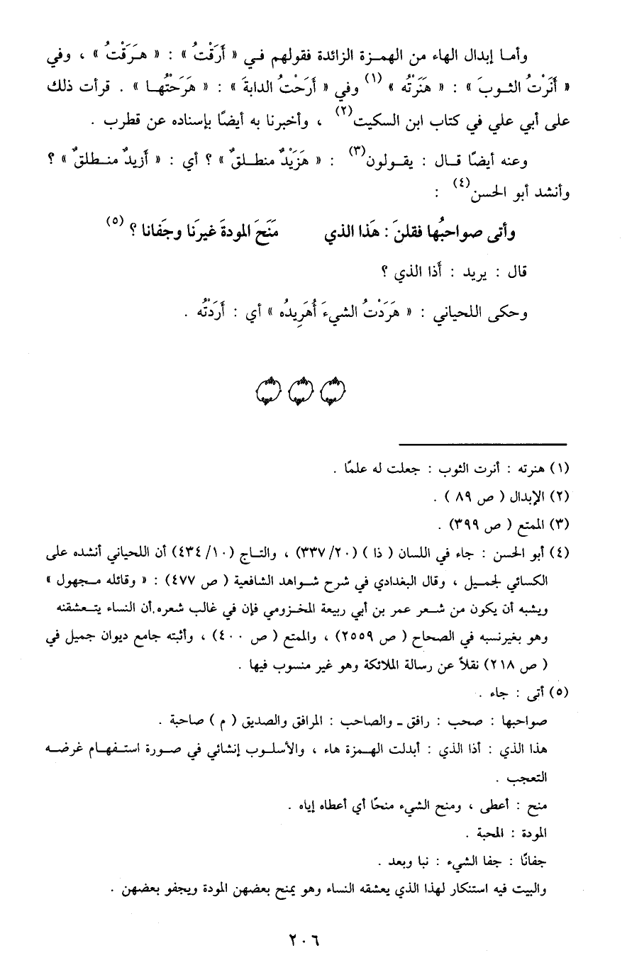 وأما إبدال الهاء من الهمزة الزائدة فقولهم في "أرقْتُ": "هرقْتُ"، وفي "أنرْتُ الثوب": "هنرْتُه"1 وفي "أرحْتُ الدابةَ": "هرحتُها". قرأت ذلك على أبي علي في كتاب ابن السكيت2، وأخبرنا به أيضًا بإسناده عن قطرب.