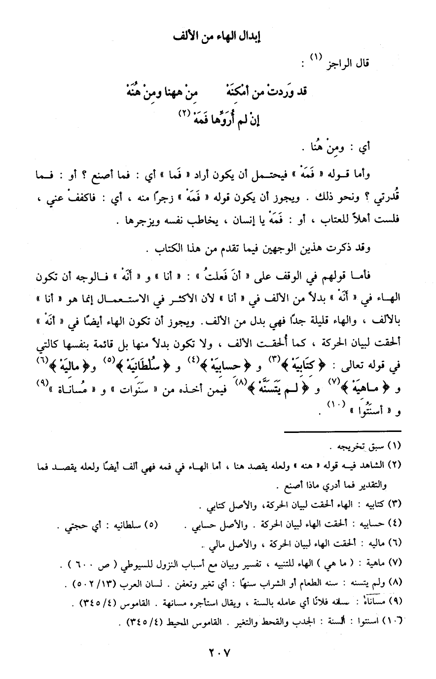 2 الشاهد فيه قوله "هُنَهْ" ولعله يقصد هنا، أما الهاء في "فَمَهْ" فهي ألف أيضًا ولعله يقصد فما والتقدير فما أدري ماذا أصنع.