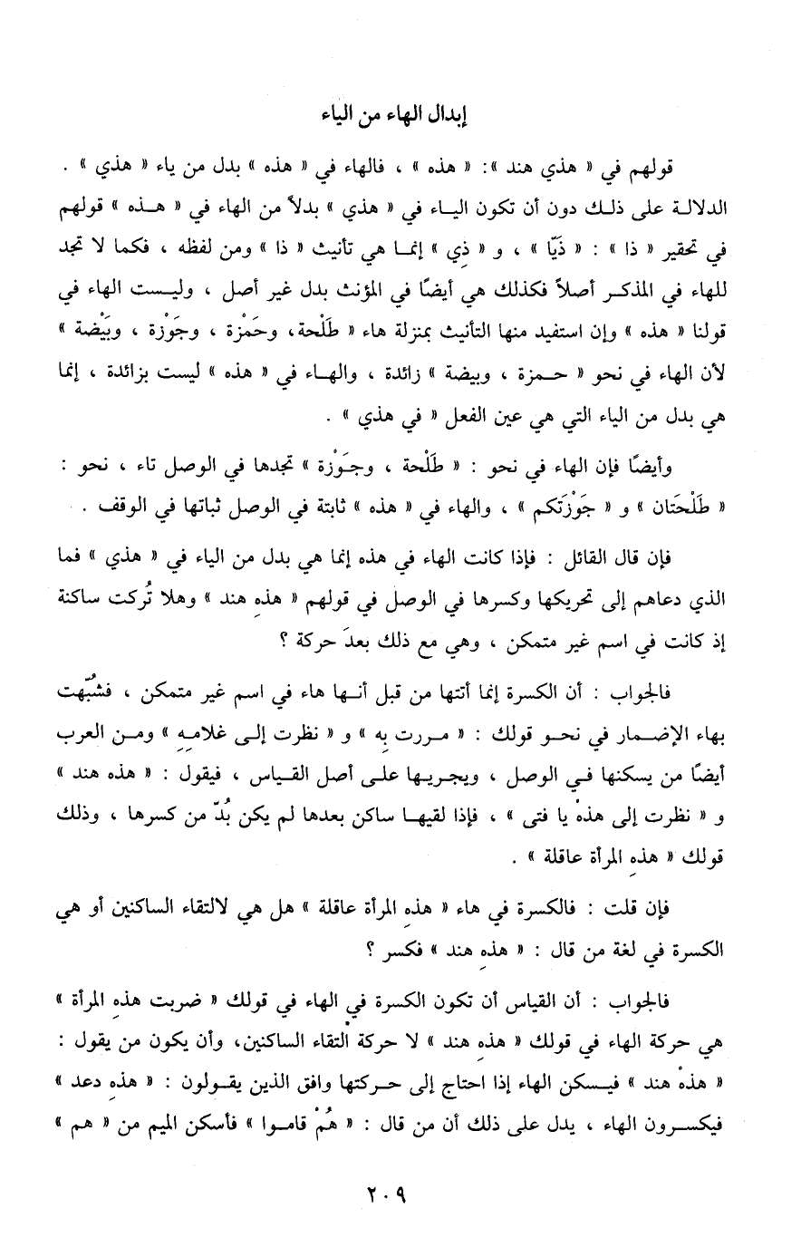قولهم في "هذي هند": "هذه"، فالهاء في "هذه" بدل من ياء "هذي". الدلالة على ذلك دون أن تكون الياء في "هذي" بدلا من الهاء في "هذه" قولهم في تحقير "ذا": "ذيّا" و"ذي" إنما هي تأنيث "ذا" ومن لفظه، فكما لا تجد للهاء في المذكر أصلا فكذلك هي أيضًا في المؤنث بدلٌ غيرُ أصل، وليست الهاء في قولنا "هذه" وإن استفيد منها التأنيث بمنزلة هاء "طلحة، وحمزة، وجوزة، وبيضة" لأن الهاء في نحو "حمزة وبيضة" زائدة، والهاء في "هذه" ليست بزائدة، إنما هي بدل من الياء التي هي عين الفعل "في هذي".