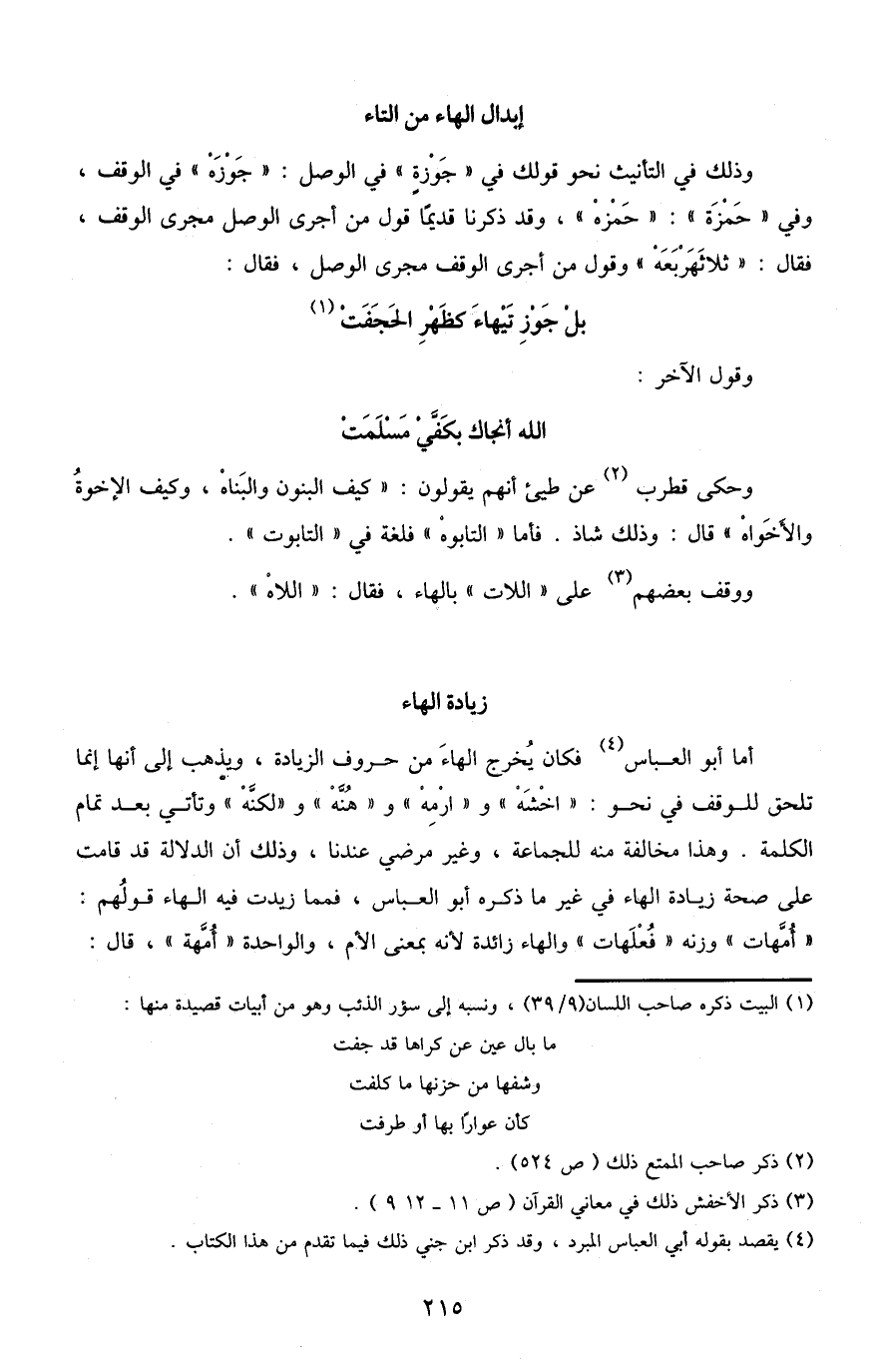 أما أبو العباس4 فكان يخرج الهاءَ من حروف الزيادة، ويذهب إلى أنها إنما تلحق للوقف في نحو: "اخْشَهْ" و"ارْمِهْ" و"هُنَّهْ" و"لكنَّهْ" وتأتي بعد تمام الكلمة. وهذا مخالفة منه للجماعة، وغير مرضٍ عندنا، وذلك أن الدلالة قد قامت على صحة زيادة الهاء في غير ما ذكره أبو العباس، فمما زيدت فيه الهاء قولهم: "أُمَّهات" وزنه "فُعْلَهات" والهاء زائدة لأنه بمعنى الأم، والواحدة "أُمَّهة"، قال: