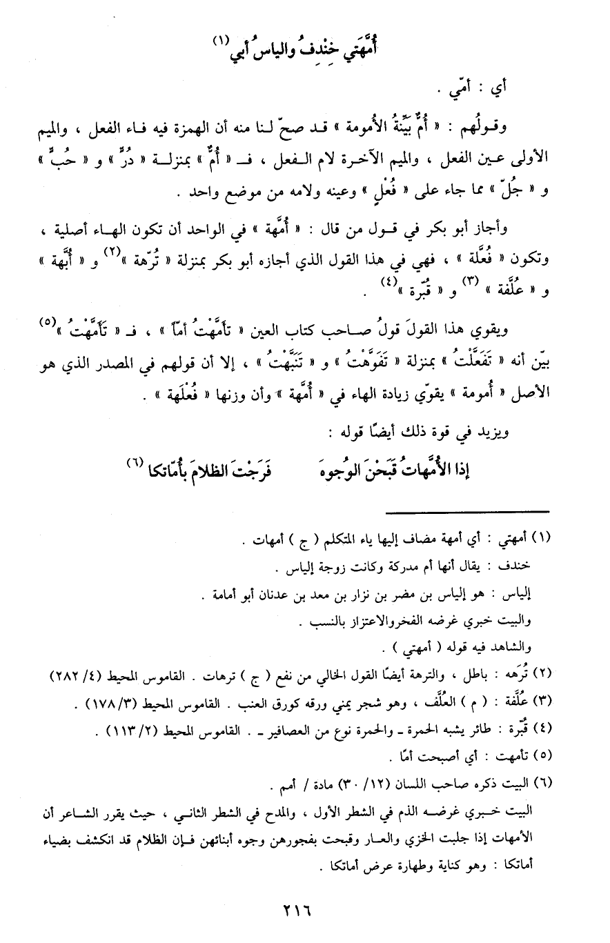 ويقوي هذا القولَ قولُ صاحب كتاب العين "تأمَّهْتُ أُمًّا"، فـ "تأمَّهْتُ"5 بين أنه "تَفَعَّلْتُ" بمنزلة "تَفَوَّهتُ" و"تَنَبَّهتُ"، إلا أن قولهم في المصدر الذي هو الأصل "أمومة" يقوي زيادة الهاء في "أُمَّهَة" وأن وزنها "فُعْلَهَة".