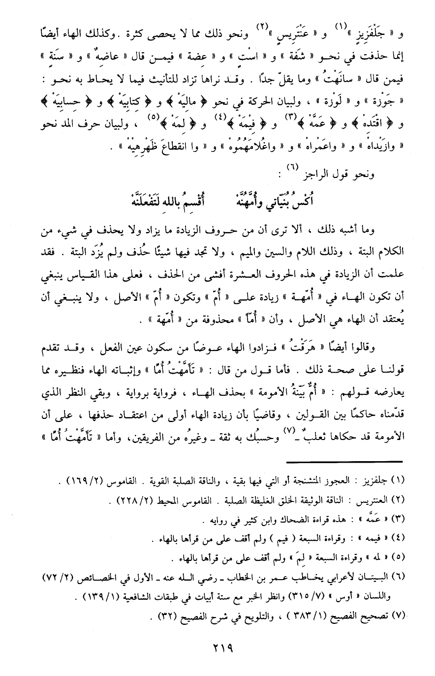 و "جَلْفَزِيزٍ"1 و"عَنْتَرِيسٍ"2 ونحو ذلك مما لا يحصى كثرة. وكذلك الهاء أيضًا إنما حذفت في نحو "شَفة" و"اسْتٍ" و"عِضة" فيمن قال "عَاضِهٌ" و"سَنةٍ" فيمن قال "سانَهْتُ" وما يقلّ جدًّا. وقد نراها تزاد للتأنيث فيما لا يحاط به نحو: "جَوْزة" و"لَوْزة"، ولبيان الحركة في نحو {مالِيَهْ} و {كِتَابِيَهْ} و {حِسَابِيَهْ} و {اقْتَدِهْ} و {عَمَّهْ} 3 و {فِيمَهْ} 4 و {لِمَهْ} 5، ولبيان حرف المد نحو "وازِيْدَاهْ" و"واعَمْرَاه" و"واغُلامَهُمُوهْ" و"وا انقطاعَ ظَهْرِهيهْ".