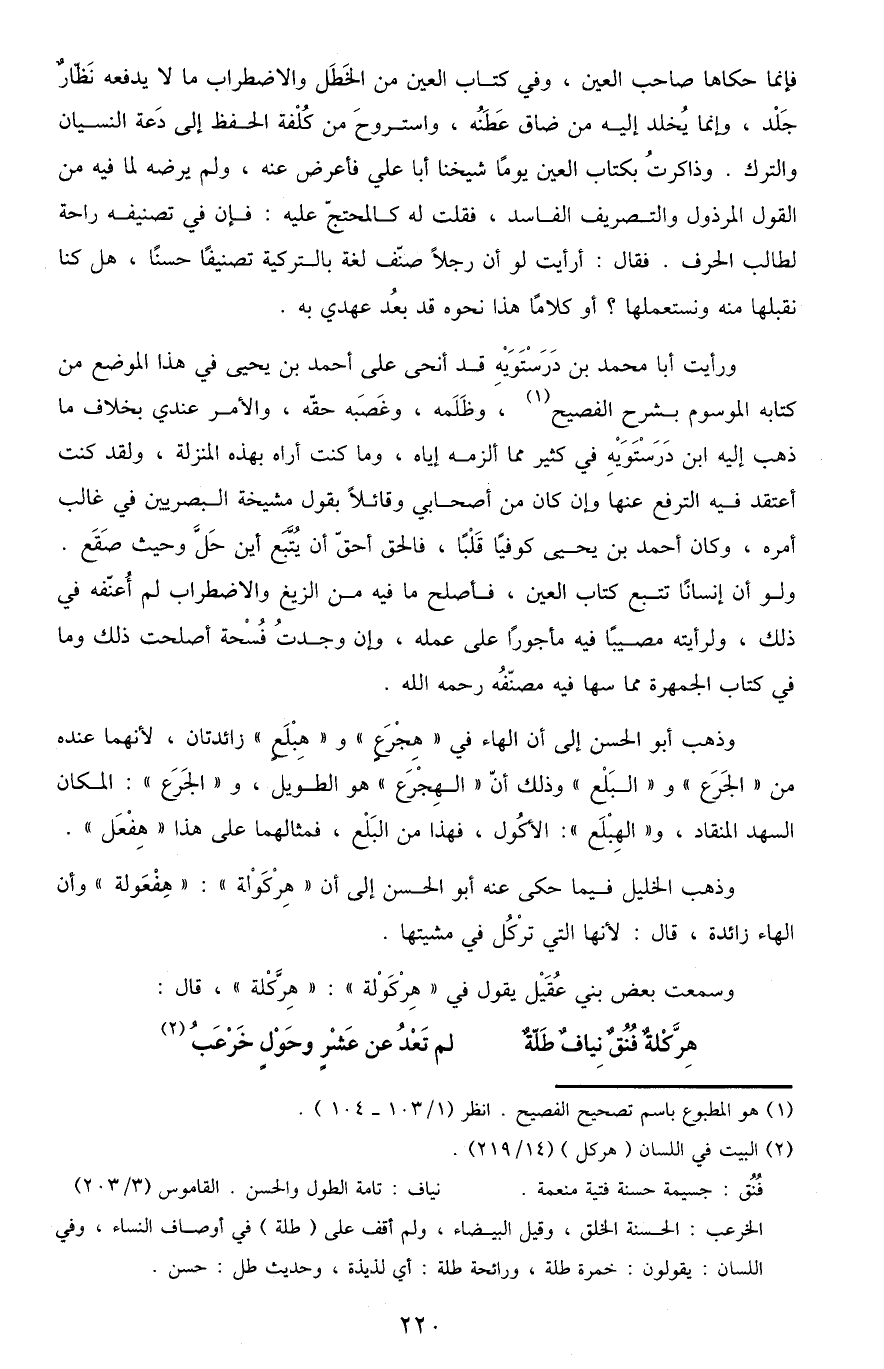 ورأيت أبا محمد بن درستويه قد أنحى على أحمد بن يحيى في هذا الموضع من كتابه الموسوم بشرح الفصيح1، وظلمه، وغصبه حقه، والأمر عندي بخلاف ما ذهب إليه ابن درستويه في كثير مما ألزمه إياه، وما كنت أراه بهذه المنزلة، ولقد كنت أعتقد فيه الترفع عنها وإن كان من أصحابي وقائلا بقول مشيخة البصريين في غالب أمره، وكان أحمد بن يحيى كوفيًّا قلبًا، فالحق أحق أن يتبع أين حل وحيث صَقَعَ. ولو أن إنسانًا تتبع كتاب العين، فأصلح ما فيه من الزيغ والاضطراب لم أُعَنِّفْهُ في ذلك، ولرأيته مصيبًا فيه مأجورًا على عمله، وإن وجدت فسحة أصلحت ذلك وما في كتاب الجمهرة مما سها فيه مُصَنِّفُهُ رحمه الله.