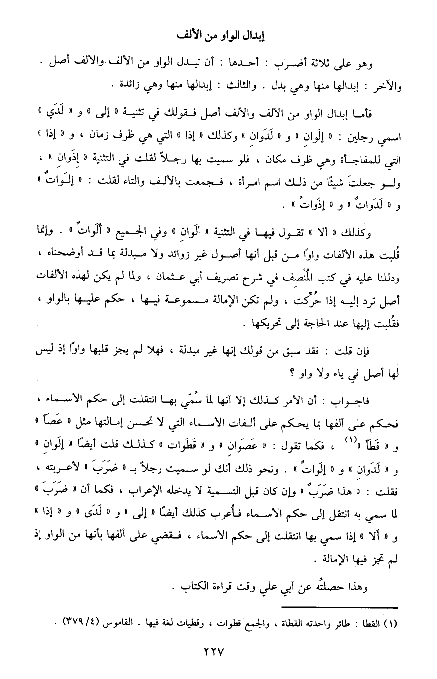 فأما إبدال الواو من الألف والألف أصل فقولك في تثنية "إلى" و"لدى" اسمي رجلين: "إلَوَانِ" و"لَدَوَانِ" وكذلك "إذا" التي هي ظرف زمان، و"إذ" التي للمفاجأة وهي ظرف مكان، فلو سميت بها رجلا لقلت في التثنية "إذَوَانِ"، ولو جعلت شيئًا من ذلك اسم امرأةٌ، فجمعت بالألف والتاء لقلت: "إَلَوَات" و"لَدَوَات" و"إِذَوَات".