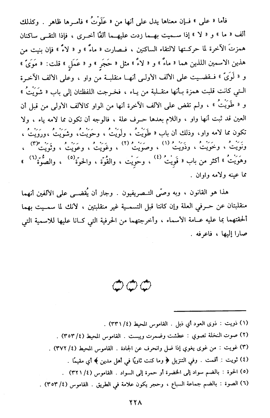 فأما "على" فإن معناها يدل على أنها من "علوْتُ" فأمرها ظاهرٌ. وكذلك ألف "ما" و"لا" إذا سميتَ بهما زدت عليهما ألفًا أخرى، فإذا التقى ساكنان همزت الآخرة لما حركتها لالتقاء الساكنين، فصارت "ماءٌ" و"لاءٌ" فإن بنيت من هذين الاسمين اللذين هما "ماءٌ" و"لاءٌ" مثل "حَجَرٍ" و"عَمَلٍ" قلت: "مَوَىً" و"لَوَى ً" فقضيت على الألف الأولى أنها منقلبة من واو، وعلى الألف الآخرة التي كانت قلبت همزة بأنها منقلبة من ياء، فخرجت اللفظتان إلى باب "شويْتُ" و"طويْتُ"، ولم تقض على الألف الآخرة أنها من الواو كالألف الأولى من قبل أن العين قد ثبت أنها واو، واللام بعدها حرف علة، فالوجه أن تكون مما لامه ياء، ولا تكون مما لامه واو، وذلك أن باب "طويْتُ، ولويْتُ، وحويْتُ، وشويْتُ، ورويْتُ، ونويْتُ، وخويْتُ، وذويْتُ1، وصويْتُ2، وغويْتُ، وعويْتُ، وثويْتُ3، وهويْتُ" أكثر من باب "قَوِيتُ4، وحَوِيتُ، والقوةُ، والحوةُ5، والصوةُ6" مما عينه ولامه واوان.