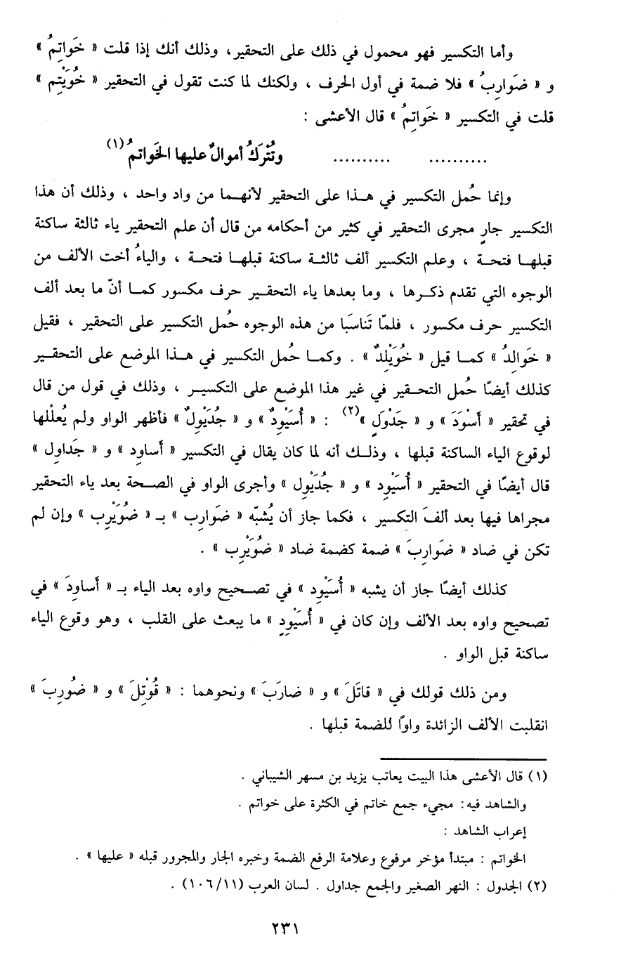 وأما التكسير فهو محمول في ذلك على التحقير، وذلك أنك إذا قلت "خَوَاتِم" و"ضَوَارِب" فلا ضمة في أول الحرف، ولكنك لما كنت تقول في التحقير "خُوَيْتِم" قلت في التكسير "خَوَاتِم" قال الأعشى: