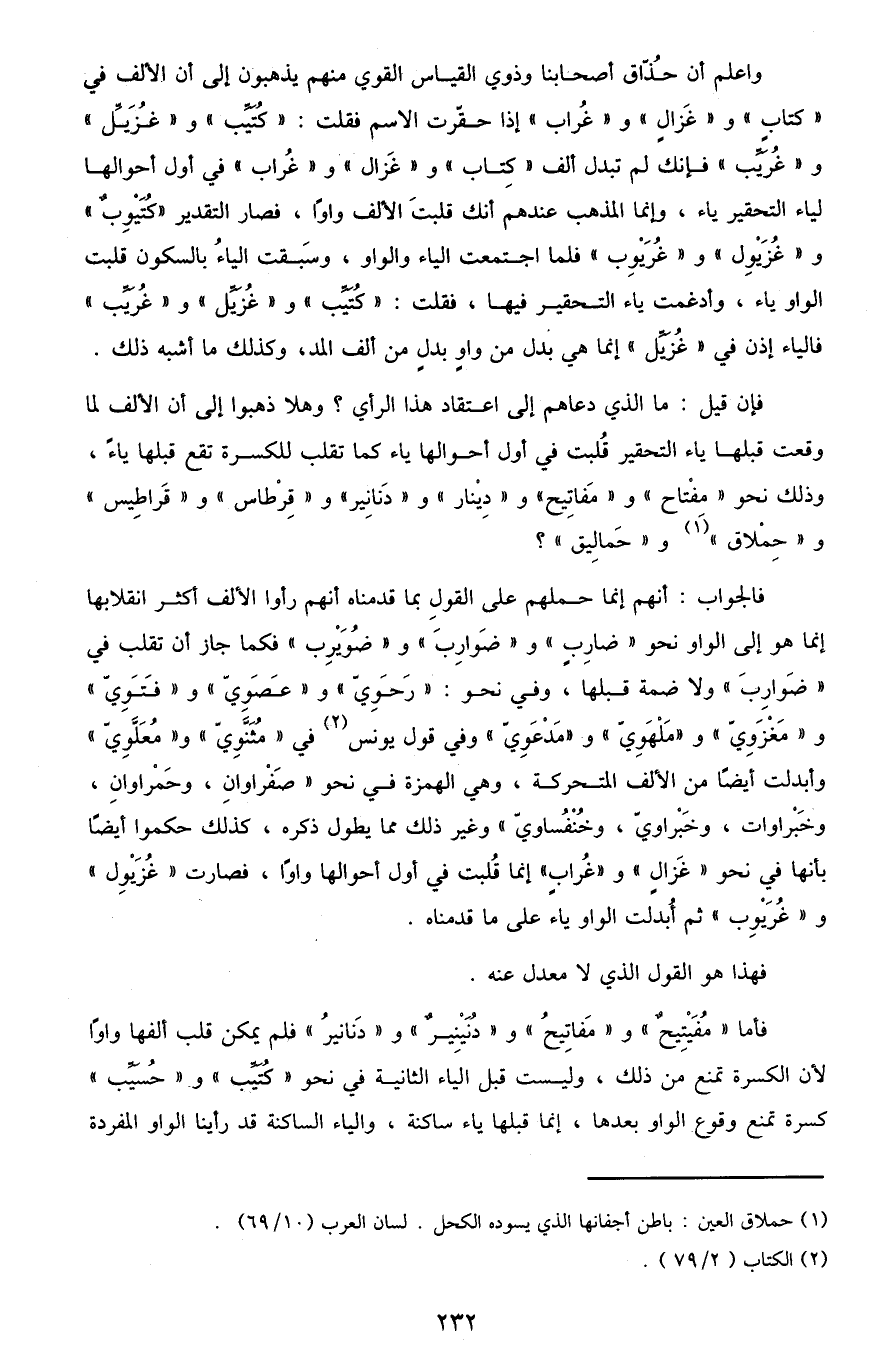 واعلم أن حذاق أصحابنا وذوي القياس القوي منهم يذهبون إلى أن الألف في "كتاب" و"غزال" و"غراب" إذا حقرتَ الاسم فقلت: "كُتَيِّب" و"غُزَيِّل" و"غُرَيِّب" فإنك لم تبد ألف "كتاب" و"غزال" و"غراب" في أول أحوالها لياء التحقير ياء، وإنما المذهب عندهم أنك قلبت الألف واوًا، فصار التقدير "كُتَيْوِبٌ" و"غُزَيْوِلٌ" و"غُرَيْوِبٌ" فلما اجتمعت الياء والواو، وسبقت الياء بالسكون قلبت الواو ياء، وأدغمت ياء التحقير فيها، فقلت: "كتيب" و"غزيل" و"غريب" فالياء إذن في "غزيل" إنما هي بدل من واوٍ بدلٍ من ألف المد، وكذلك ما أشبه ذلك.