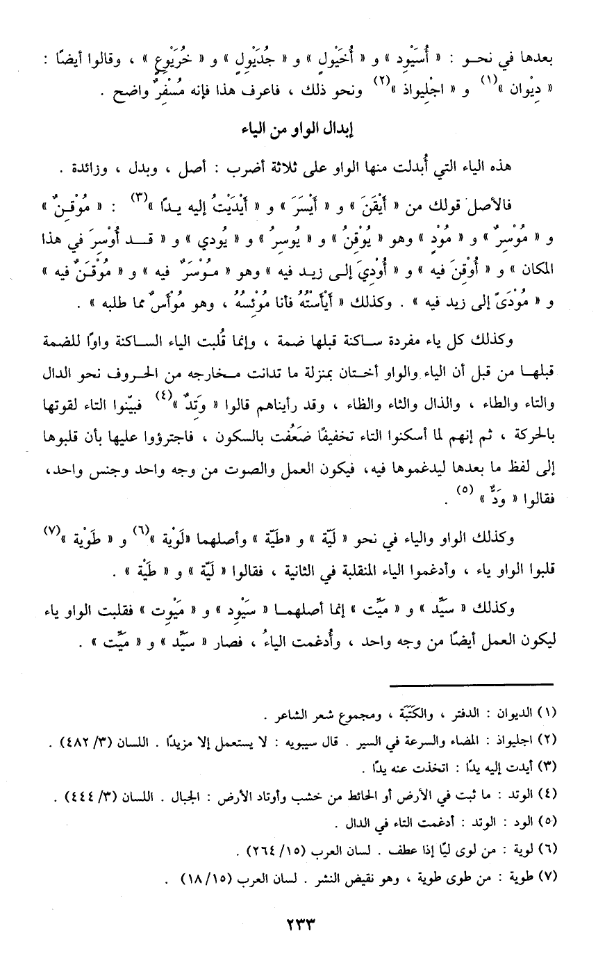 وكذلك الواو والياء في نحو "لَيِّة" و"طَيَّة" وأصلهما "لَوْيَة"4 و"طَوْيَة"5 قلبوا الواو ياء، وأدغموا الياء المنقلبة في الثانية، فقالوا "لية" و"طية".