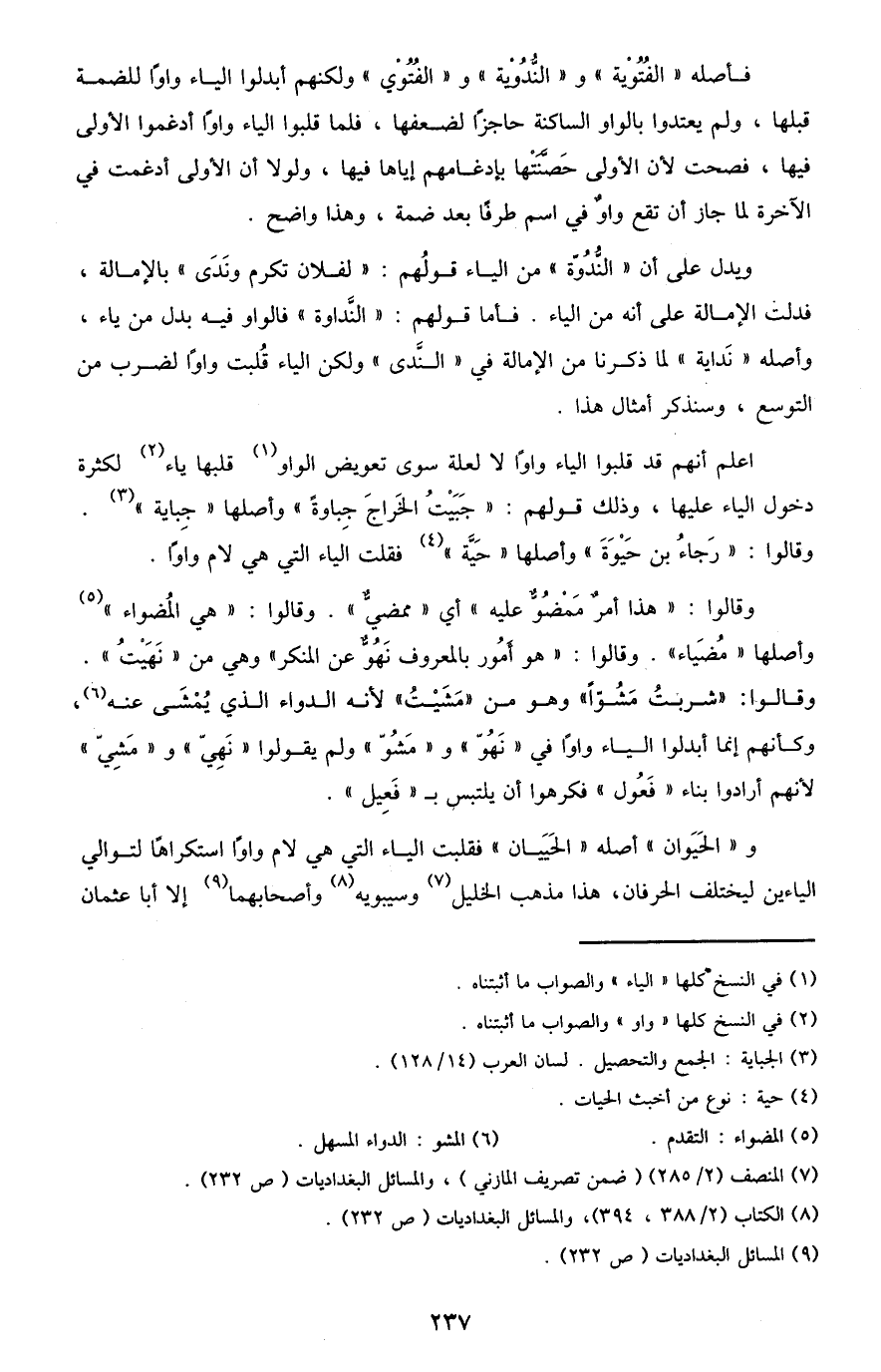 وقالوا: "هذا أَمْرٌ مَمْضُوٌّ عليه" أي "ممضيٌّ". وقالوا: "هي المُضواء"5 وأصلها "مضياء". وقالوا: "هو أَمُورٌ بالمعروفِ نَهُوٌّ عن المنكرِ" وهي من "نَهَيْتُ". وقالوا: "شَرِبتُ مَشُوًّا" وهو من "مشيت" لأنه الدواء الذي يُمْشَى عنه6، وكأنهم أبدلوا الياء واوًا في "نَهُوٌّ" و"مَشْوٌّ" ولم يقولوا "نهي" و"مشي" لأنهم أرادوا بناء "فَعُول" فكرهوا أن يلتبس بـ "فَعِيل".