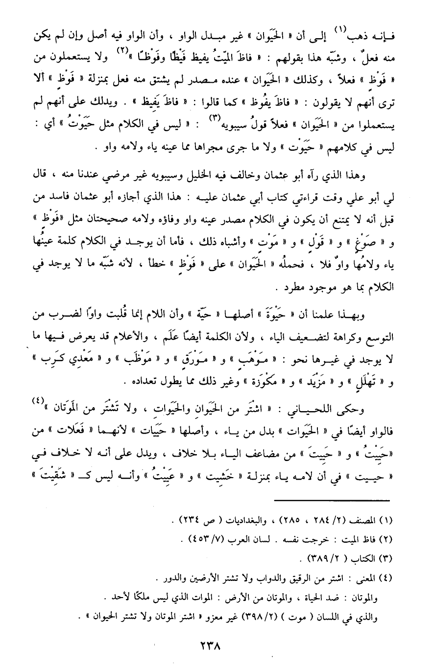فإنه ذهب1 إلى أن "الحيوان" غيرُ مبدل الواو، وأن الواو فيه أصل وإن لم يكن منه فعلٌ، وشبه هذا بقولهم: "فاظَ الميتُ يفيظُ فَيْظًا وفَوْظًا"2 ولا يستعملون من "فوظ" فعلا، وكذلك "الحيوان" عنده مصدر لم يشتق منه فعل بمنزلة "فوظ" ألا ترى أنهم لا يقولون: "فاظ يفوظ" كما قالوا: "فاظ يفيظ". ويدلك على أنهم لم يستعملوا من "الحيوان" فعلا قول سيبويه3: "ليس في الكلام مثل حيوت" أي: ليس في كلامهم "حيوت" ولا ما جرى مجراها مما يعنه ياء ولامه واو.