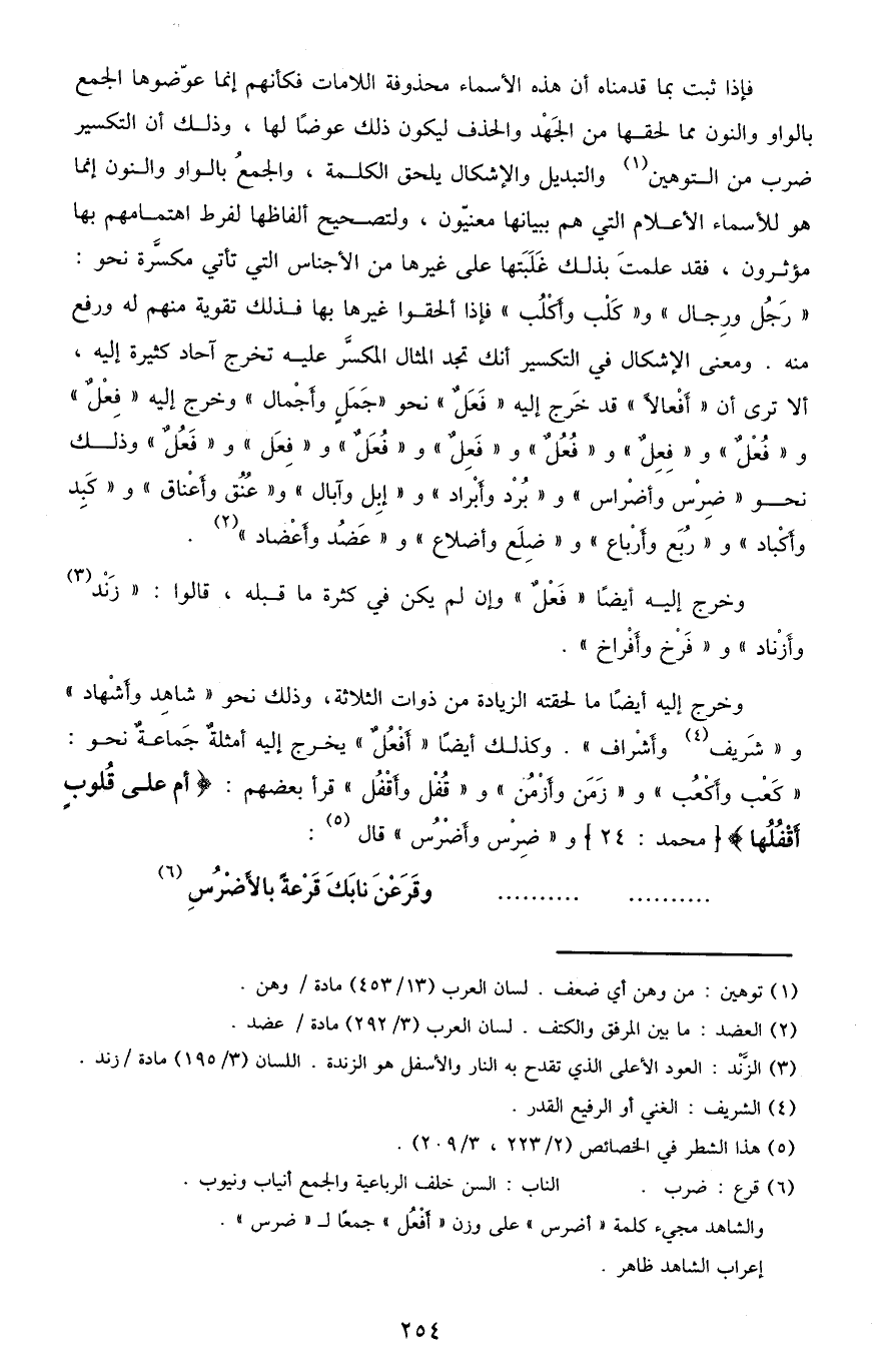 فإذا ثبت بما قدمناه أن هذه الأسماء محذوفة اللامات فكأنهم إنما عوضوها الجمع بالواو والنون مما لحقها من الجهد والحذف ليكون ذلك عوضًا لها، وذلك أن التكسير ضرب من التوهين1 والتبديل والإشكال يلحق الكلمة، والجمع بالواو والنون إنما هو للأسماء الأعلام التي هم ببيانها معنيون، ولتصحيح ألفاظها لفرط اهتمامهم بها مؤثرون، فقد علمت بذلك غلبتها على غيرها من الأجناس التي تأتي مكسرة نحو: "رجل ورجال" و"كلب وأكلب" فإذا ألحقوا غيرها فذلك تقوية منهم له ورفع منه. ومعنى الإشكال في التكسير أنك تجد المثال المكسر عليه تخرج آحاد كثيرة إليه، ألا ترى أن "أَفْعَالا" قد خرج إليه "فَعَلٌ" نحو "جَمَل وأَجْمال" وخرج إليه "فِعْل" و"فُعْل" و"فِعِلٌ" و"فُعُلٌ" و"فَعِلٌ" و"فُعَلٌ" و"فِعَلٌ" و"فَعُلٌ" وذلك نحو "ضِرْس وأَضْراس" و"بُرْد وأَبْراد" و"إِبِل وآبال" و"عُنُق وأَعْناق" و"كَبِد وأَكْباد" و"رُبَع وأَرْباع" و"ضِلَع وأَضْلاع" و"عَضْد وأَعْضاد"2.