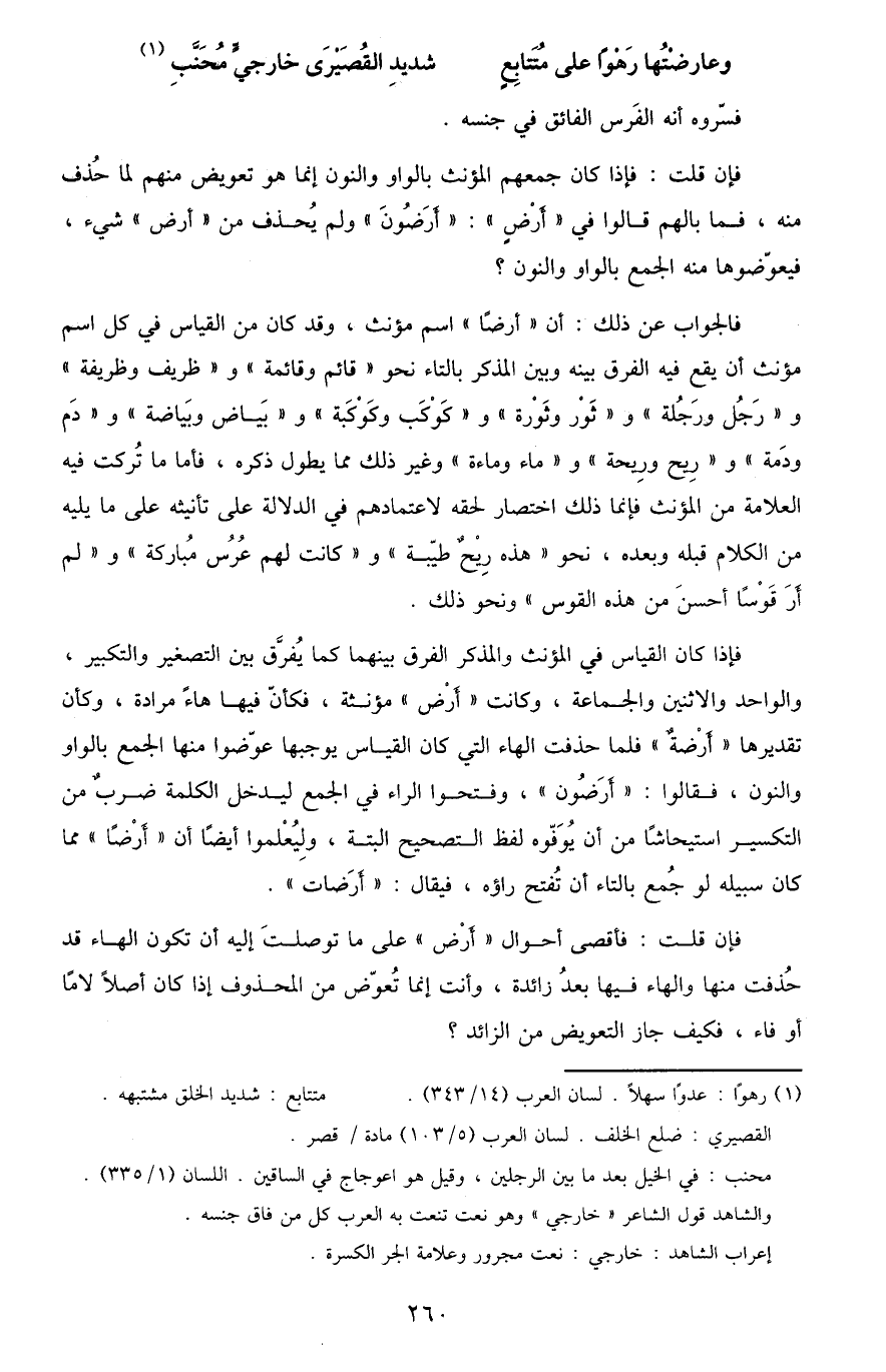 فإذا كان القياسُ في المؤنث والمذكر الفرق بينهما كما يفرق بين التصغير والتكبير، والواحد والاثنين والجماعة، وكانت "أرض" مؤنثة، فكأن فيها هاء مرادة، وكأن تقديرها "أرْضَةٌ" فلما حذفت الهاء التي كان القياس يوجبها عوضوا منها الجمع بالواو والنون، فقالوا: "أرضون"، وفتحوا الراء في الجمع ليدخل الكلمة ضرب من التكسير استيحاشًا من أن يوفوه لفظ التصحيح البتة، وليعلموا أيضًا أن "أرضًا" مما كان سبيله لو جمع بالتاء أن تفتح راؤه، فيقال: "أرَضات".