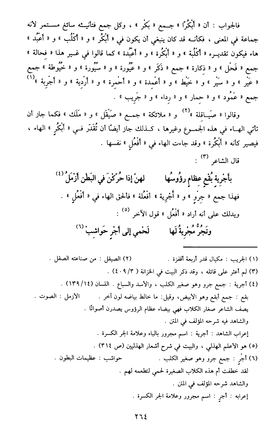 فالجواب: أن "أبْكُرًا" جمع "بَكْر"، وكل جمع فتأنيثه سائغ مستمر لأنه جماعة في المعنى، فكأنه قد كان ينبغي أن يكون في "أبْكُر" و"أكْلُب" و"أعْبُد" هاء فيكون تقديره "أكلبه" و"أبكرة" و"أعبدة" كما قالوا في غير هذا "فِحالة" جمع "فَحْل" و"ذِكارة" جمع "ذَكَر" و"عُيُورة" و"سُيُورة" و"خُيُوطة" جمع "عَيْر" و"سَيْر" و"خَيْط" و"أعْمِدة" و"أحْمِرة" و"أرْدِية" و"أجْرِبة"1 جمع "عمُود" و"حِمار" و"رِداء" و"جَرِيب".