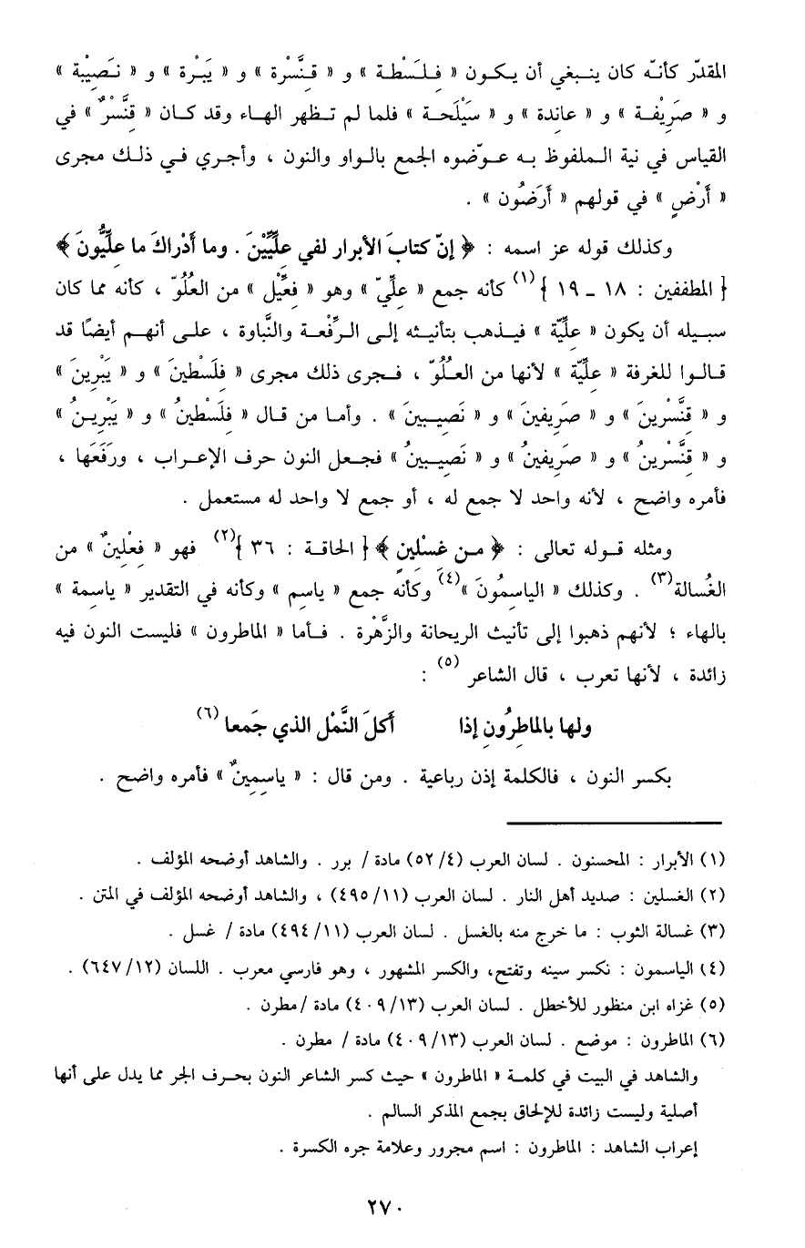 وكذلك قوله عزَّ اسمه: {كَلَّا إِنَّ كِتَابَ الْأَبْرَارِ لَفِي عِلِّيِّينَ، وَمَا أَدْرَاكَ مَا عِلِّيُّونَ} [المطففين: 18-19] كأنه جمع "عِلِّيّ" وهو "فِعِّيل" من العُلُّوّ، كأنه مما كان سبيله أن يكون "عِلِّيَّة" فيذهب بتأنيثه إلى الرفعة والنباوة، على أنهم أيضًا قد قالوا للغرفة "عِلِّيَّة": لأنها من العلو، فجرى ذلك مجرى "فلسطينَ" و"يبرينَ" و"قنسرينَ" و"صريفينَ" و"نصيبينَ". وأما من قال "فلسطينُ" و"يبرينُ" و"قنسرينُ" و"صريفينُ" و"نصيبينُ" فجعل النون حرف الإعراب، ورفعها، فأمره واضح، لأنه واحد لا جمع له، أو جمع لا واحد له مستعمل.