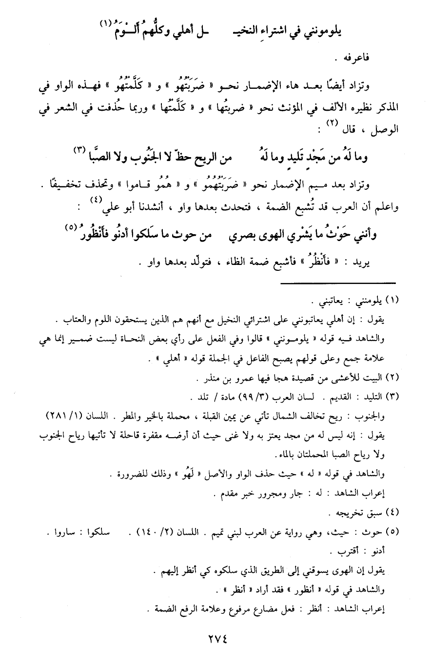 والشاهد فيه قوله "يلومونني" قالوا وفي الفعل على رأي بعض النحاة ليست ضمير إنما هي علامة جمع وعلى قولهم يصبح الفاعل في الجملة قوله "أهلي".