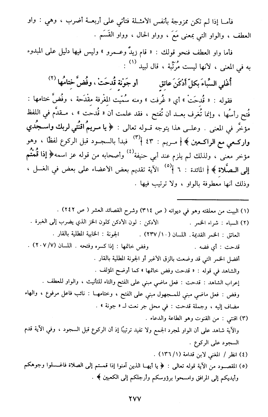 فقوله: "قدحت" أي "غرفت" ومنه سميت المغرفة مقدحة، وفض ختامها: فتح رأسها، وإنما تغرف بعد أن تفتح، فقد علمت أن "قدحت"، مقدم في اللفظ مؤخر في المعنى. وعلى هذا يتوجه قوله تعالى: {يَا مَرْيَمُ اقْنُتِي لِرَبِّكِ وَاسْجُدِي وَارْكَعِي مَعَ الرَّاكِعِينَ} [مريم: 43] 3 فبدأ بالسجود قبل الركوع لفظًا، وهو مؤخر معنى، ولذلك لم يلزم عند أبي حنيفة4 وأصحابه من قوله عَزَّ اسْمُهُ {إِذَا قُمْتُمْ إِلَى الصَّلاةِ} [المائدة: 6] 5 الآية تقديم بعض الأعضاء على بعض في الغسل، وذلك أنها معطوفة بالواو، ولا ترتيب فيها.