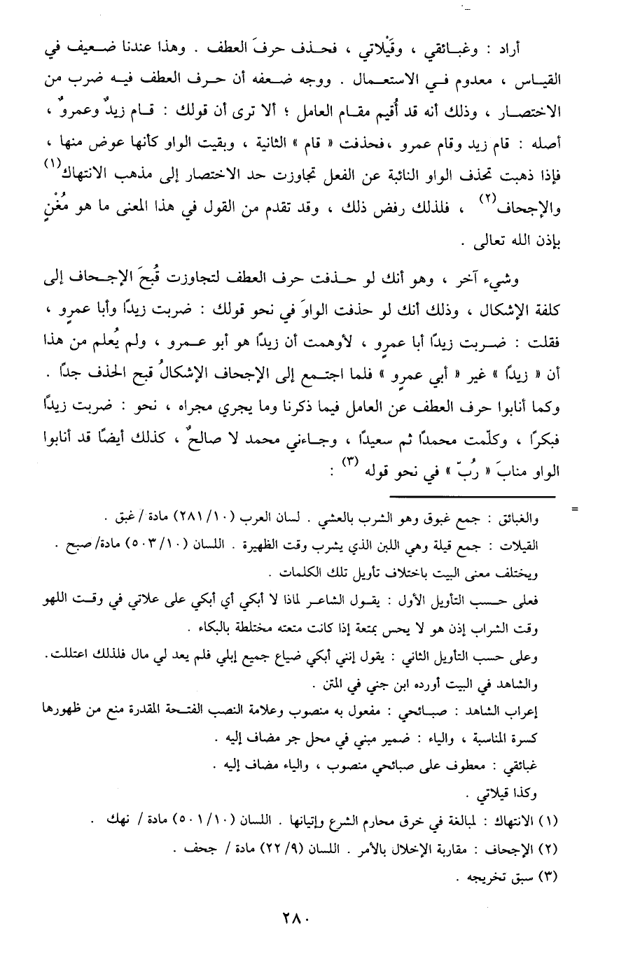 أراد: وغبائقي، وقيلاتي فحذف حرف العطف. وهذا عندنا ضعيف في القياس، معدوم في الاستعمال. ووجه ضعفه أن حرف العطف فيه ضرب من الاختصار، وذلك أنه قد أقيم مقام العامل؛ ألا ترى أن قولك: قام زيد وعمرو، أصله: قام زيد وقام عمرو، فحذفت "قام" الثانية، وبقيت الواو كأنها عوض منها، فإذا ذهبت تحذف الواو النائبة عن الفعل تجاوزت حد الاختصار إلى مذهب الانتهاك1 والإجحاف2، فلذلك رفض ذلك، وقد تقدم من القول في هذا المعنى ما هو مغنٍ بإذن الله تعالى.