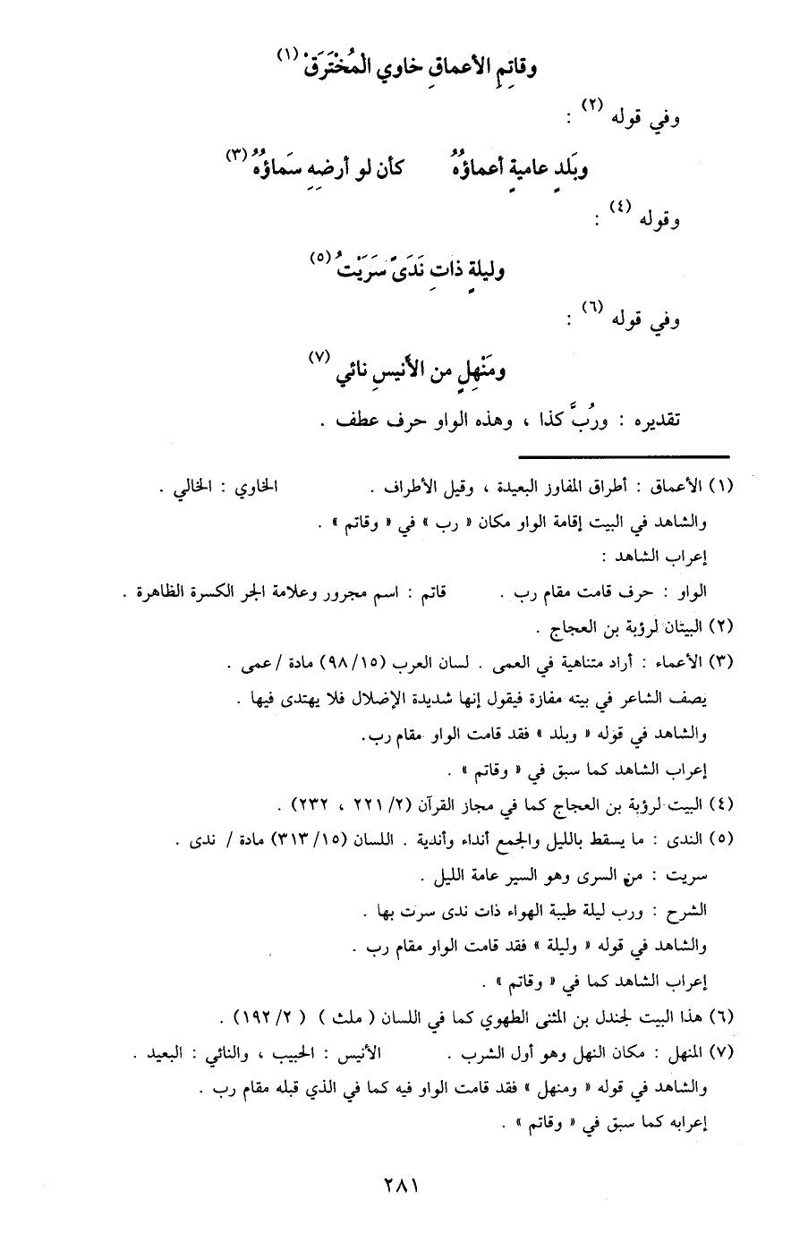 والشاهد في قوله "ومنهل" فقد قامت الواو فيه كما في الذي قبله مقام رب.