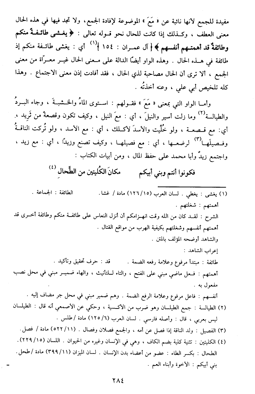 مفيدة للجمع لأنها نائبة عن "مع" الموضوعة لإفادة الجمع، ولا تجد فيها في هذه الحال معنى العطف، وكذلك إذا كانت للحال نحو قوله تعالى: {يَغْشَى طَائِفَةً مِنْكُمْ وَطَائِفَةٌ قَدْ أَهَمَّتْهُمْ أَنْفُسُهُمْ} [آل عمران: من الآية 154] 1 أي: يغشى طائفة منكم إذ طائفة في هذه الحال. وهذه الواو أيضًا الدالة على معنى الحال غير معراة من معنى الجمع، ألا ترى أن الحال مصاحبة لذي الحال، فقد أفادت إذن معنى الاجتماع. وهذا كله تلخيص أبي علي، وعنه أخذته.