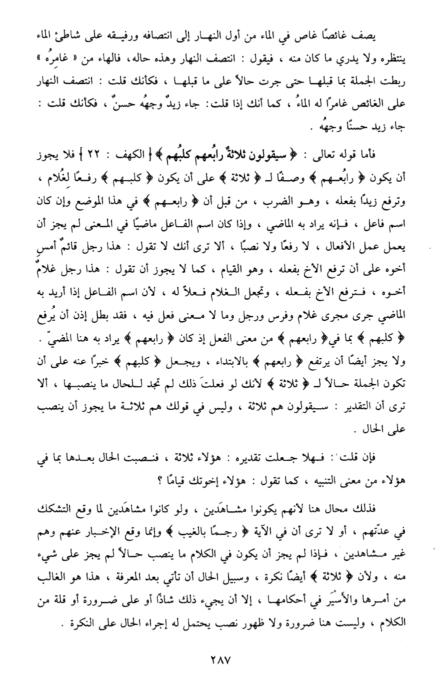فذلك محال هنا لأنهم يكونوا مشاهدين، ولو كانوا مشاهدين لما وقع التشكك في عدتهم، أولا ترى أن في الآية {رَجْماً بِالْغَيْبِ} وإنما وقع الإخبار عنهم وهم غير مشاهدين، فإذا لم يجز أن يكون في الكلام ما ينصب حالا لم يجز على شيء منه، ولأن "ثلاثة" أيضًا نكرة، وسبيل الحال أن تأتي بعد المعرفة، هذا هو الغالب من أمرها والأسير في أحكامها، إلا أن يجيء ذلك شاذًا أو على ضرورة أو قلة من الكلام، وليست هنا ضرورة ولا ظهور نصب يحتمل له إجراء الحال على النكرة.