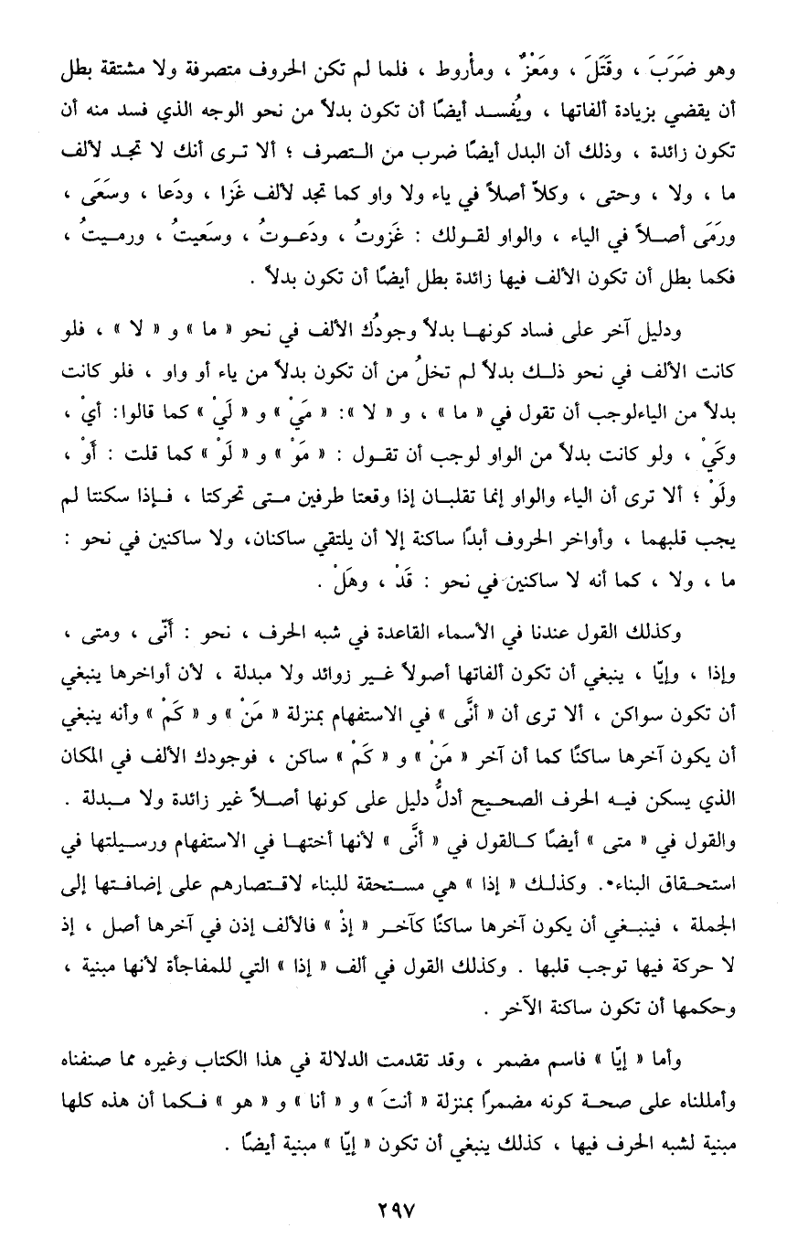 وكذلك القول عندنا في الأسماء القاعدة في شبه الحرف، نحو: أنَّى، ومَتَى، وإِذَا، وإيّا، ينبغي أن تكون ألفاتها أصولا غير زوائد ولا مبدلة، لأن أواخرها ينبغي أن تكون سواكن، ألا ترى أن "أنى" في الاستفهام بمننزلة "مَنْ" و"كَمْ" وأنه ينبغي أن يكون آخرها ساكنًا كما أن آخر "مَنْ" و"كَمْ" ساكن، فوجودك الألف في المكان الذي يسكن فيه الحرف الصحيح أدل دليل على كونها أصلا غير زائدة ولا مبدلة. والقول في "متى" أيضًا كالقول في "أنى" لأنها أختها في الاستفهام ورسيلتها في استحقاق البناء. وكذلك "إذا" هي مستحقة للبناء لاقتصارهم على إضافتها إلى الجملة، فينبغي أن يكون آخرها ساكنًا كآخر "إذ" فالألف إذن في آخرها أصل، إذ لا حركة فيها توجب قلبها. وكذلك القول في ألف "إذا" التي للمفاجأة لأنها مبنية، وحكمها أن تكون ساكنة الآخر.