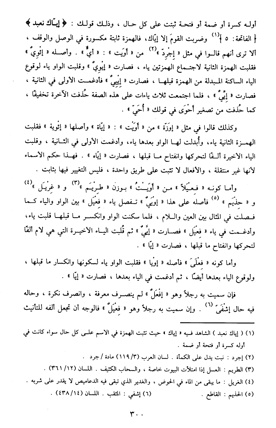 1 {إِيَّاكَ نَعْبُدُ} الشاهد فيه "إياك" حيث نثبت الهمزة في الاسم على كل جال سواء كانت في أوله كسرة أو فتحة أو ضمة.