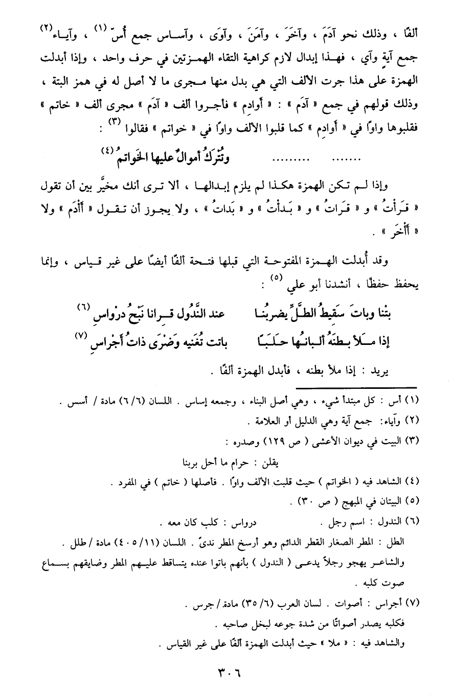 ألفا، وذلك نحو آدم، وآخر، وأمن، وآوى، وآساس جمع أس1، وآياء2 جمع آية وآي، فهذا إبدال لازم كراهية التقاء الهمزتين في حرف واحد، وإذا أبدلت الهمزة على هذا جرت الألف التي هي بدل منها مجرى ما لا أصل له في همز البتة، وذلك قولهم في جمع "آدم": و"أوادم" فأجروا ألف "آدم" مجرى "ألف" "خاتم" فقلبوها واوا في "أوادم" كما قلبوا الألف واوا في "خواتم" فقالوا3: