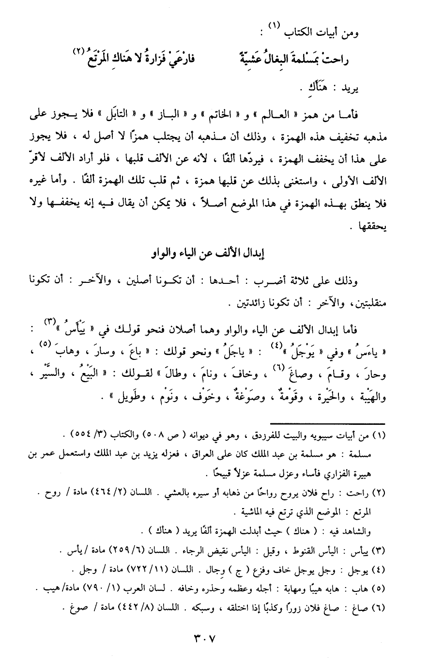 فأما إبدال الألف عن الياء والواو وهما أصلان فنحو قولك في "ييأس"1: "ياءس" وفي "يوجل"2: "ياجل" ونحو قولك: "باع، وسار، وهاب3، وحار، وقام، وصاغ4، وخاف، ونام، وطال" لقولك: "البيع، والسير، والهيبة، والحيرة، وقومة، وصوغة، وخوف، ونوم، وطويل".