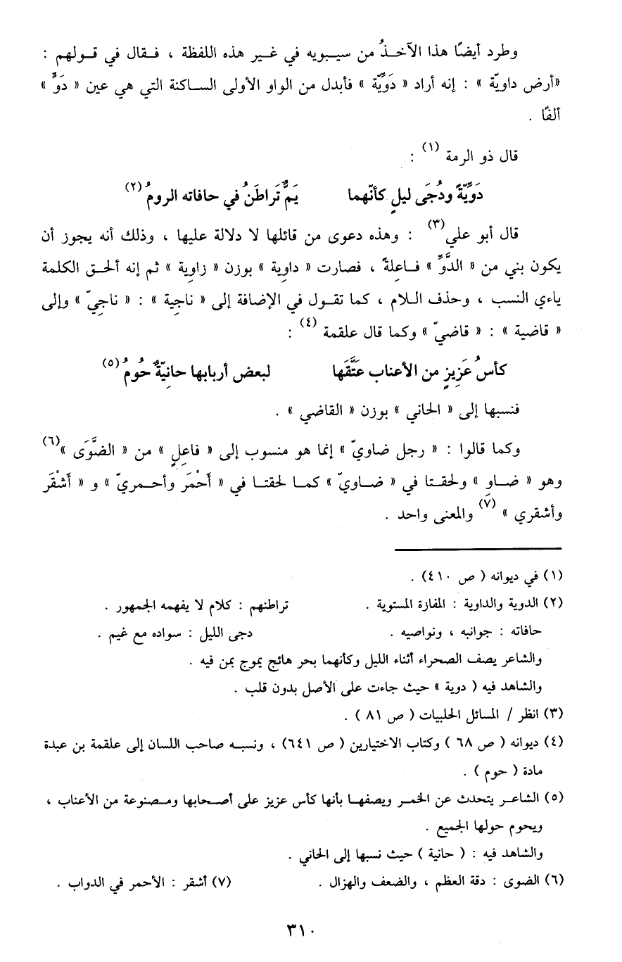 قال أبو علي3: وهذه دعوى من قائلها لا دلالة عليها، وذلك أنه يجوز أن يكون بني من "الدو" فاعلة، فصارت "دواية" بوزن "زاوية" ثم أنه الحق الكلمة ياءي النسب، وحذف اللام، كما تقول في الإضافة إلى "ناجية": "ناجي" وإلى "قاضية": "قاضي" وكما قال علقمة4: