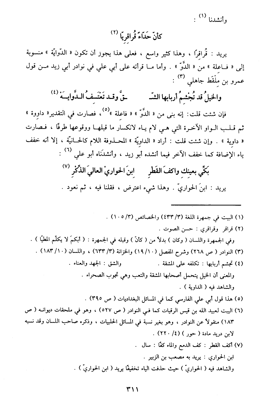 يديد: قراقرا، وهذا كثير واسع، فعلى هذا يجوز أن تكون "الدواية" منسوبة إلى "فاعلة" من "الدو". وأما ما قرأته على ابي علي في نوادر أبي زيد من قول عمرو بن ملقط جاهلي3: