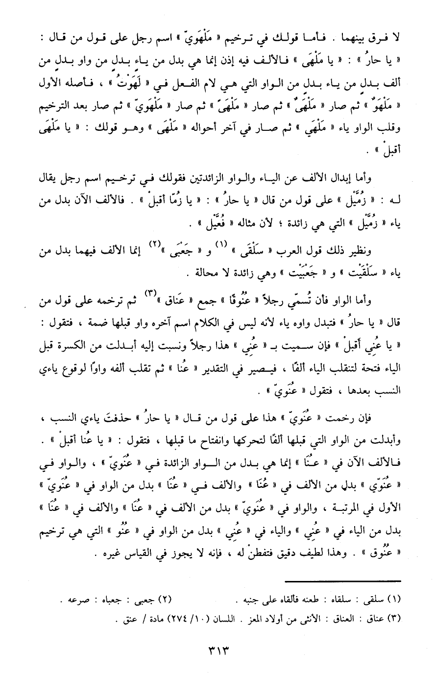 وأما الواو فأن تسمي رجلا "عنوقا" جمع "عناق"3 ثم ترخمه على قول من قال "يا حار" فتبدل واوه ياء لأنه ليس في الكلام اسم آخره واو قبلها ضمة، فتقول: "ياعني أقبل" فإن سميت ب "عني" هذا رجلا ونسبت إليه أبدلت من الكسرة قبل الياء فتحة لتنقلب الياء ألفا، فيصير في التقدير "عنا" ثم تقلب ألفه واوا لنوع لوقوع ياءي النسب بعدها، فتقول "عنوي".