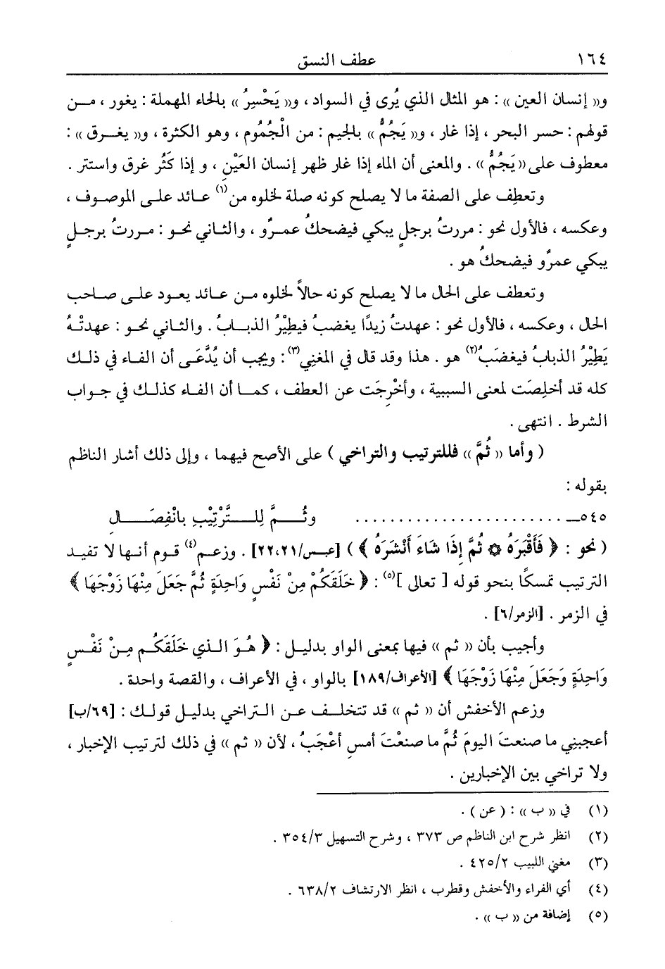 "نحو: {فَأَقْبَرَهُ، ثُمَّ إِذَا شَاءَ أَنْشَرَهُ} " [عبس: 21-22] . وزعم4 قوم أنها لا تفيد الترتيب تمسكًا بنحو قوله "تعالى"5: {خَلَقَكُمْ مِنْ نَفْسٍ وَاحِدَةٍ ثُمَّ جَعَلَ مِنْهَا زَوْجَهَا} في الزمر. [الزمر: 6] .