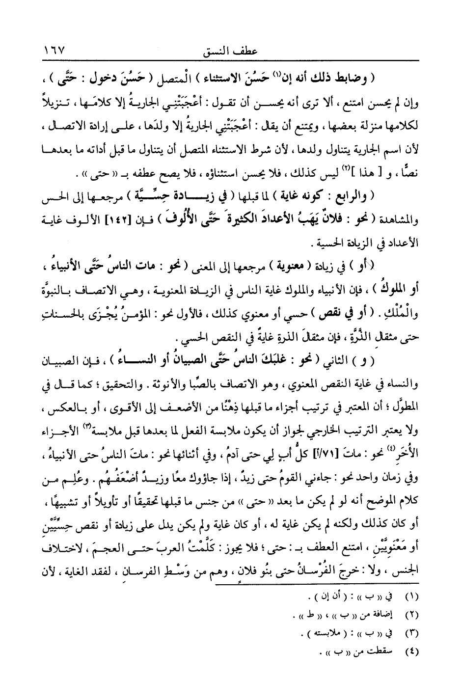 "و" الثاني "نحو: غلبك الناس حتى الصبيان أو النساء"، فإن الصبيان والنساء في غاية النقص المعنوي، وهو الاتصاف بالصبا والأنوثة. والتحقيق؛ كما قال في المطول؛ أن المعتبر في ترتيب أجزاء ما قبلها ذهنًا من الأضعف إلى الأقوى، أو بالعكس، ولا يعتبر الترتيب الخارجي لجواز أن يكون ملابسة الفعل لما بعدها قبل ملابسة3 الأجزاء الأخر4 نحو: مات كل أب لي حتى آدم، وفي أثنائها نحو: مات الناس حتى الأنبياء، وفي زمان واحد نحو: جاءني القوم حتى زيد، إذا جاءوك معًا وزيد أضعفهم. وعلم من كلام الموضح أنه لو لم يكن ما بعد "حتى" من جنس ما قبلها تحقيقًا أو تأويلا أو تشبيهًا، أو كان كذلك ولكنه لم يكن غاية له، أو كان غاية ولم يكن يدل على زيادة أو نقص حسيين أو معنويين، امتنع العطف بـ: حتى؛ فلا يجوز: كلمت العرب حتى العجم، لاختلاف الجنس، ولا: خرج الفرسان حتى بنو فلان، وهم من وسط الفرسان، لفقد الغاية، لأن