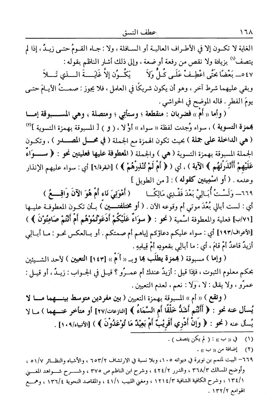 "وأما "أم" فضربان: منقطعة؛ وستأتي؛ ومتصلة، وهي المسبوقة إما بهمزة التسوية"، سواء وجدت لفظة "سواء" أو لا، "و" "المسبوقة بهمزة التسوية"2 "هي الداخلة على جملة" بحيث تكون الهمزة مع الجملة "في محل المصدر"، وتكون الجملة المسبوقة بهمزة التسوية "هي" والجملة "المعطوفة عليها فعليتين نحو: {سَوَاءٌ عَلَيْهِمْ أَأَنْذَرْتَهُمْ} الآية"، أي " {أَمْ لَمْ تُنْذِرْهُمْ} [البقرة: 6] أي: سواء عليهم الإنذار وعدمه. "أو اسميتين كقوله": [من الطويل] .