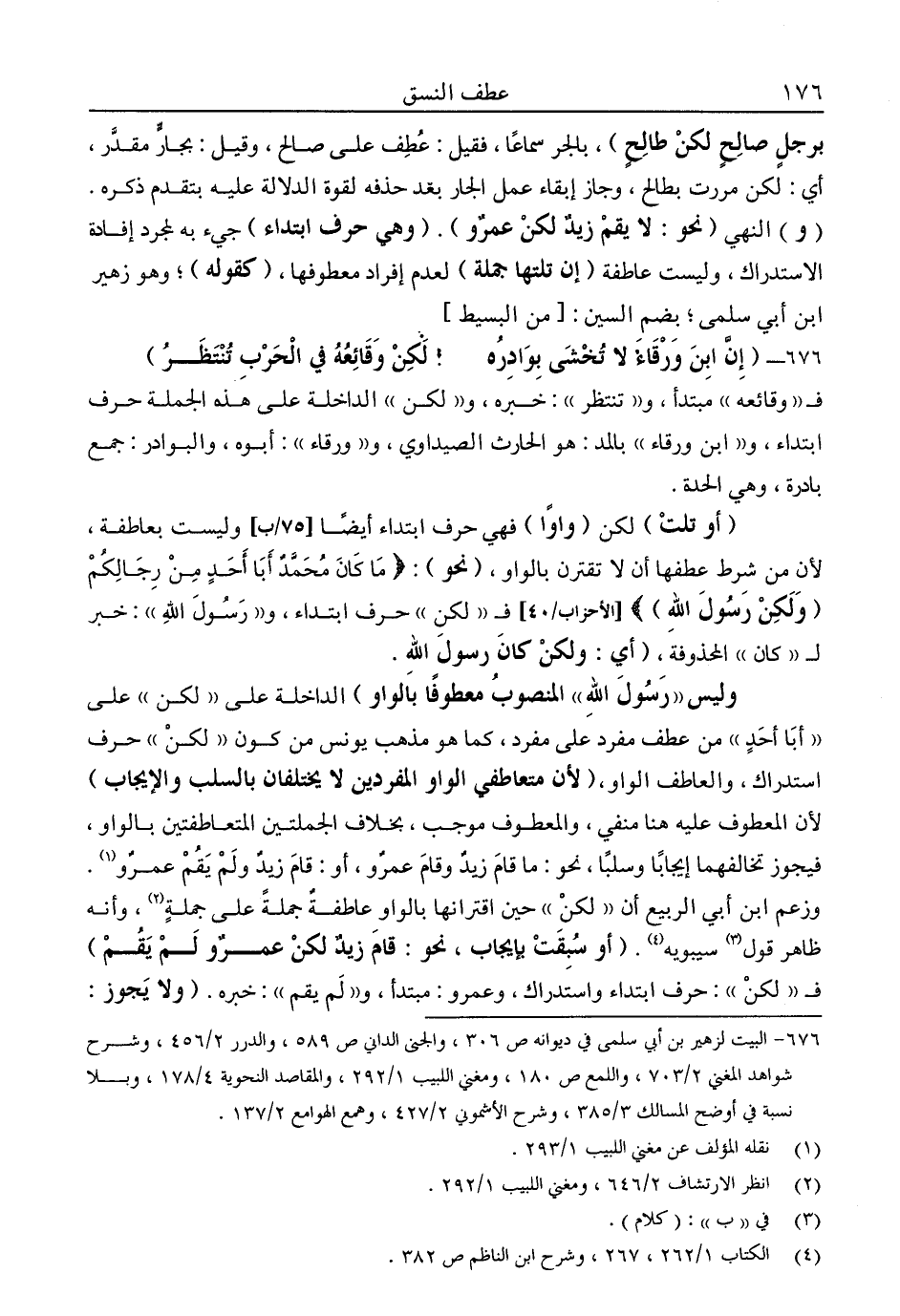"أو تلت" لكن "واوًا" فهي حرف ابتداء أيضًا وليست بعاطفة، لأن من شرط عطفها أن لا تقترن بالواو، "نحو": {مَا كَانَ مُحَمَّدٌ أَبَا أَحَدٍ مِنْ رِجَالِكُمْ " وَلَكِنْ رَسُولَ اللَّهِ "} [الأحزاب: 40] فـ"لكن" حرف ابتداء، و"رسول الله": خبر لـ"كان" المحذوفة، "أي: ولكن كان رسول الله.