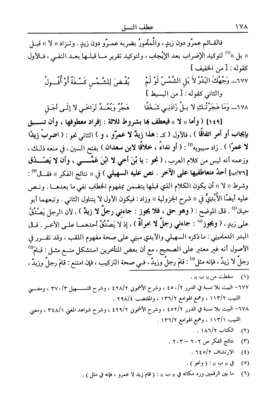 "وأما "لا" فيعطف بها بشروط ثلاثة: إفراد معطوفها، وأن تسبق بإيجاب أو أمر اتفاقًا"، فالأول "كـ: هذا زيد لا عمرو، و" الثاني نحو: "اضرب زيدًا لا عمرًا". زاد سيبويه2: "أو نداء، خلافا لابن سعدان" بفتح السين، في منعه ذلك، وزعمه أنه ليس من كلام العرب، "نحو: يابن أخي لا ابن عمي، وأن لا يصدق أحد متعاطفيها على الآخر. نص عليه السهيلي" في "نتائج الفكر" فقال3: وشرط "لا" أن يكون الكلام الذي قبلها يتضمن بمفهوم الخطاب نفي ما بعدها. ونص عليه ايضًا الأبدي في "شرح الجزولية" وزاد: فيكون الأول لا يتناول الثاني. وتبعهما أبو حيان4. قال الموضح: "وهو حق، فلا يجوز: جاءني رجل لا زيد"، لأن الرجل يصدق على زيد، "ويجوز5: جاءني رجل لا امرأة" إذ لا يصدق أحدهما على الآخر. قال البدر الدماميني: ما ذكره السهيلي والأبدي مبني على صحة مفهوم اللقب، وقد تقرر في الأصول أنه غير معتبر على الصحيح، مع أن بعض المتأخرين استشكل منع مثل: قام [رجل لا زيد، فإنه مثل] 6: قام رجل وزيد، في صحة التركيب، فإن امتنع: قام رجل وزيد،