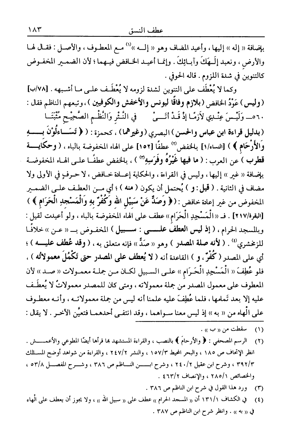 4 في الكشاف 1/ 131 أن "المسجد الحرام" عطف على "سبيل الله"، ولا يجوز أن يعطف على الهاء في "به". وانظر شرح ابن الناظم ص387.