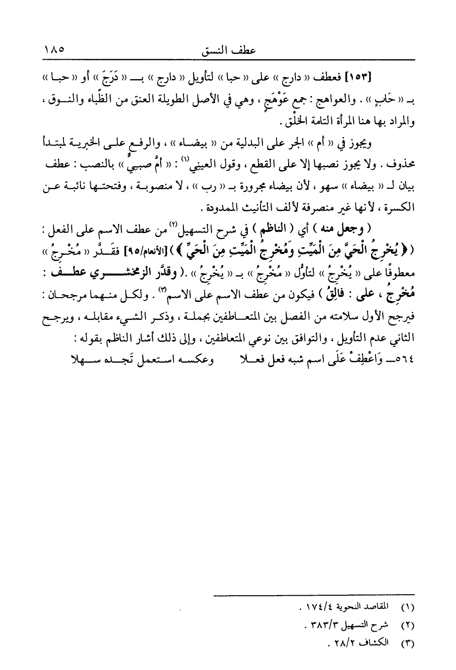 "وجعل منه" أي "الناظم" في شرح التسهيل2 من عطف الاسم على الفعل: " {يُخْرِجُ الْحَيَّ مِنَ الْمَيِّتِ وَمُخْرِجُ الْمَيِّتِ مِنَ الْحَيِّ} " [الأنعام: 95] فقدر "مخرج" معطوفًا على "يخرج" لتأول "مخرج" بـ"يخرج". "وقدر الزمخشري عطف: مخرج، على: فالق" فيكون من عطف الاسم على الاسم3. ولكل منهما مرجحان: