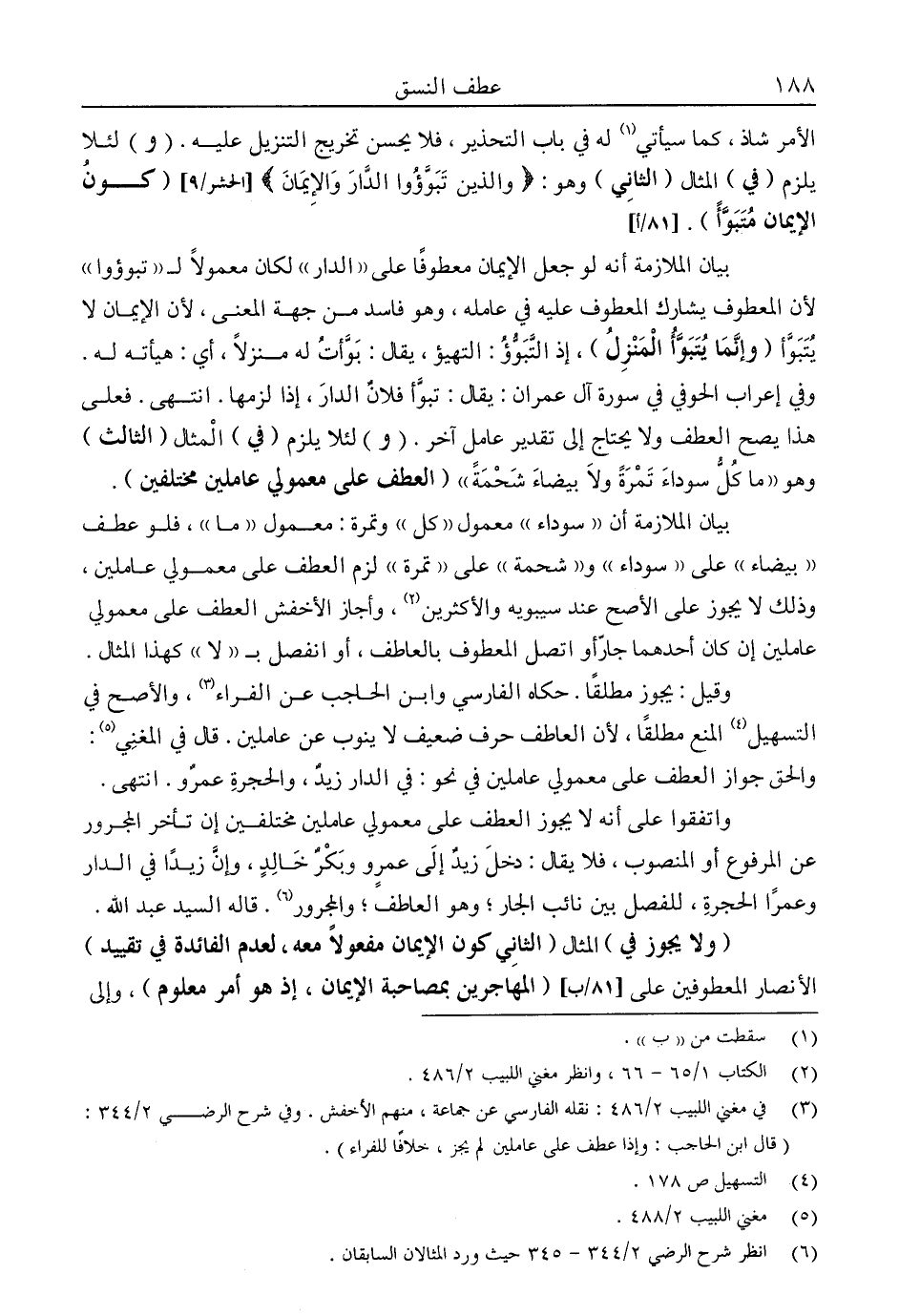 3 في مغني اللبيب 2/ 486: نقله الفارسي عن جماعة، منهم الأخفش. وفي شرح الرضي 2/ 344: "قال ابن الحاجب: وإذا عطف على عاملين لم يجز، خلافًا للفراء".