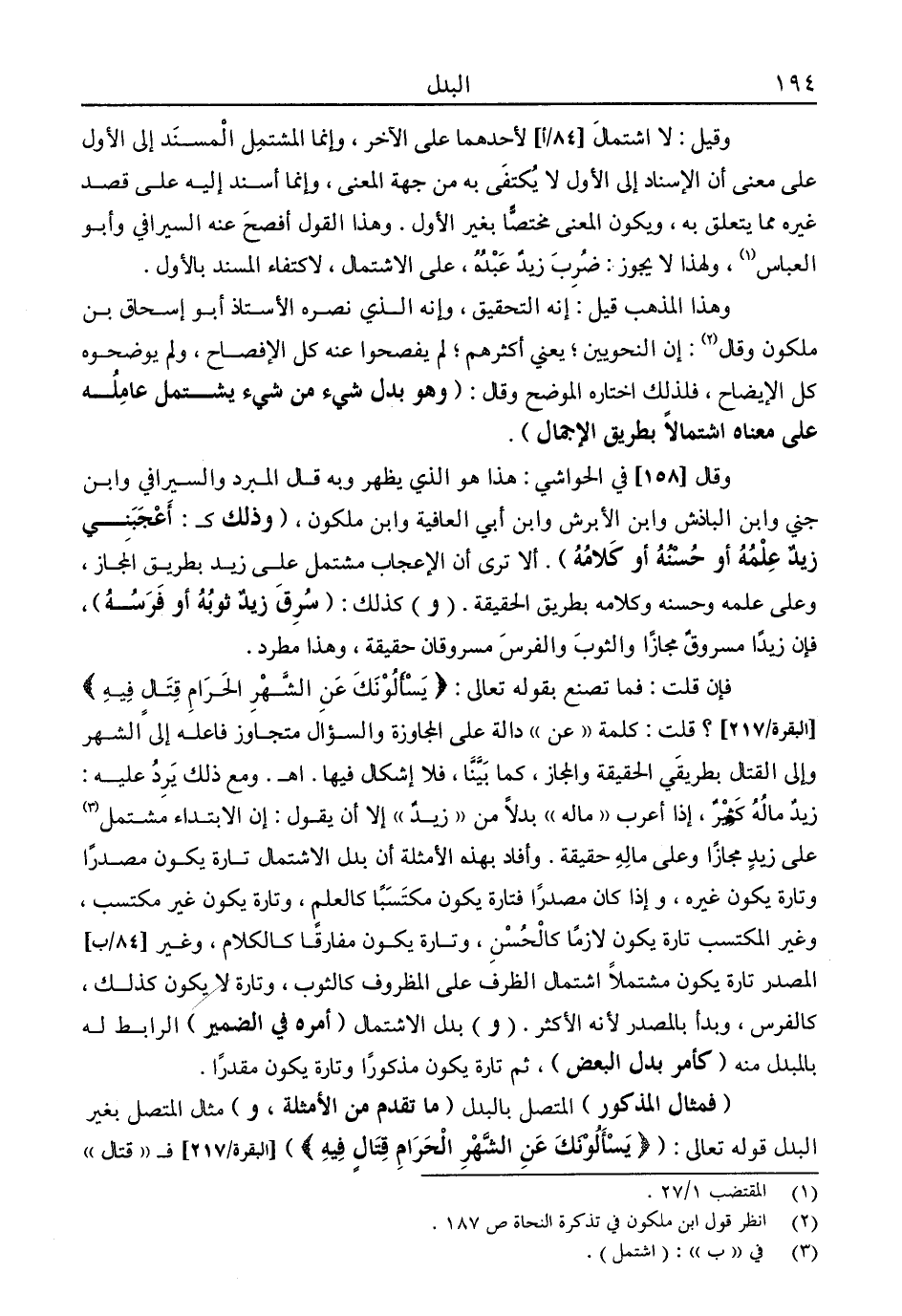 "فمثال المذكور" المتصل بالبدل "ما تقدم من الأمثلة، و" مثال المتصل بغير البدل قوله تعالى: {يَسْأَلُونَكَ عَنِ الشَّهْرِ الْحَرَامِ قِتَالٍ فِيهِ} [البقرة: 217] فـ"قتال"