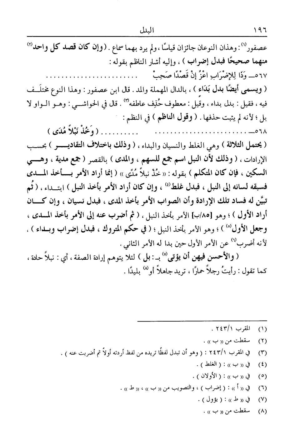 "يحتمل الثلاثة" وهي الغلط والنسيان والبداء، "وذلك باختلاف التقادير" بحسب الإرادات، "وذلك لأن النبل اسم جمع للسهم، والمدى" بالقصر "جمع مدية، وهي السكين، فإن كان المتكلم" بقوله: "خذ نبلا مدى" "إنما أراد الأمر بأخذ المدى فسبقه لسانه إلى النبل، فبدل غلط4، وإن كان أراد الأمر بأخذ النبل"، ابتداء، "ثم تبين له فساد تلك الإرادة وأن الصواب الأمر بأخذ المدى، فبدل نسيان، وإن كان أراد الأول"؛ وهو الأمر بأخذ النبل، "ثم أضرب عنه إلى الأمر بأخذ المدى، وجعل الأول"5؛ وهو الأمر بأخذ النبل؛ "في حكم المتروك، فبدل إضراب وبداء"، لأنه أضرب6 عن الأمر الأول حين بدا له الأمر الثاني.