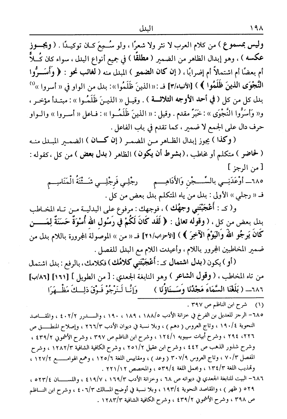 وليس بمسموع" من كلام العرب لا نثرا ولا شعرا، ولو سمع كان توكيدًا. "ويجوز عكسه"، وهو إبدال الظاهر من الضمير "مطلقًا" في جميع البدل، سواء كان كلا أم بعضًا أم اشتمالا أم أضرابًا، "إن كان الضمير" المبدل منه "لغائب نحو: {وَأَسَرُّوا النَّجْوَى الَّذِينَ ظَلَمُوا} " [الأنبياء: 3] فـ: "الذين ظلموا": بدل من الواو في "أسروا"1 بدل كل من كل "في أحد الأوجه الثلاثة". وقيل "الذين ظلموا": مبتدأ مؤخر، و"أسروا النجوى": خبر مقدم. وقيل: "الذين ظلموا": فاعل "أسروا" والواو حرف دال على الجمع لا ضمير، كما تقدم في باب الفاعل.