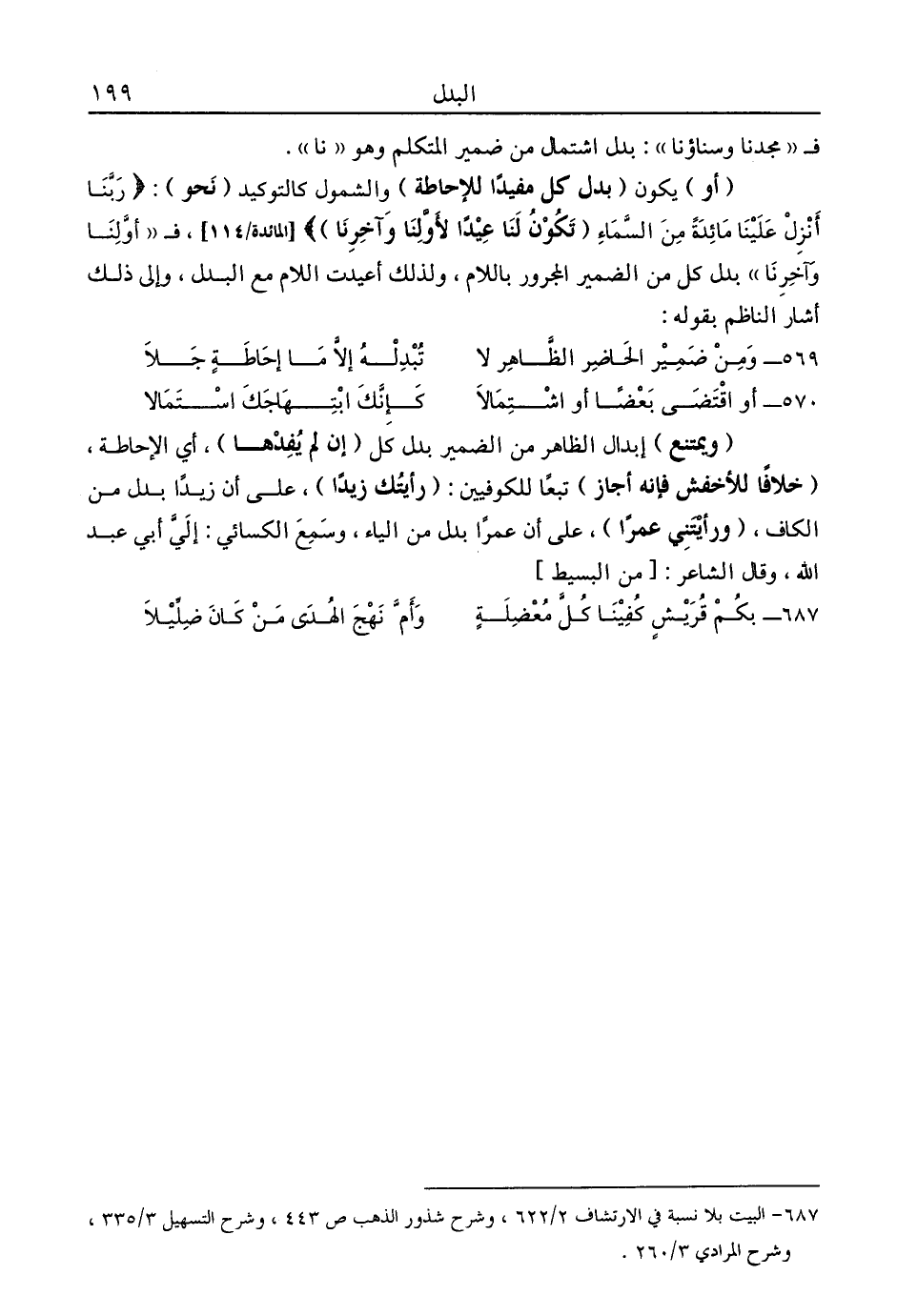 "ويمتنع" إبدل الظاهر من الضمير بدل كل "إن لم يفدها"، أي الإحاطة، "خلافًا للأخفش فإنه أجاز" تبعًا للكوفيين: "رأيتك زيدًا"، على أن زيدًا بدل من الكاف، "ورأيتني عمرًا"، على أن عمرًا بدل من الياء، وسمع الكسائي: إلى أبي عبد الله، وقال الشاعر: [من البسيط]