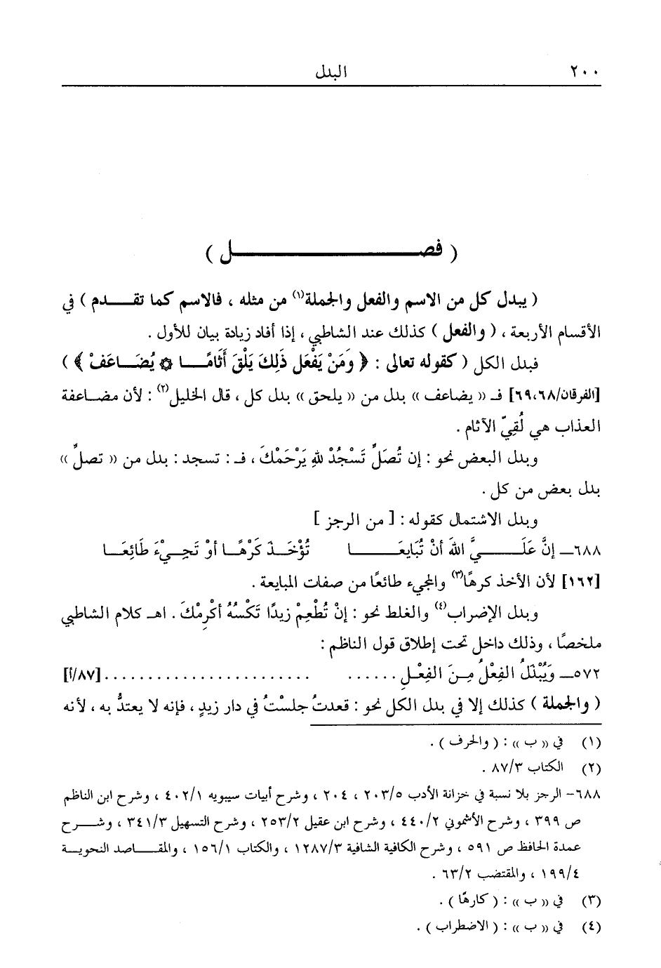 فبدل الكل "كقوله تعالى: {وَمَنْ يَفْعَلْ ذَلِكَ يَلْقَ أَثَامًا، يُضَاعَفْ} " [الفرقان: 68-69] فـ"يضاعف" بدل من "يلحق" بدل كل، قال الخليل2: لأن مضاعفة العذاب هي لقي الآثام.