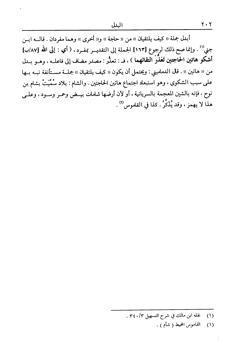 أبدل جملة "كيف يلتقيان" من "حاجة" و"أخرى" وهما مفردان. قاله ابن جني1. وإنما صح ذلك لرجوع الجملة إلى التقدير بمفرد. "أي: إلى الله أشكو هاتين الحاجتين تعذر التقائهما"، فـ: تعذر: مصدر مضاف إلى فاعله، وهو بدل من "هاتين" قال الدماميني: ويحتمل أن يكون "كيف يلتقيان" جملة مستأنفة نبه بها على سبب الشكوى، وهو استبعاد اجتماع هاتين الحاجتين. والشام: بلاد سميت بشام بن نوح، فإنه بالشين المعجمة بالسريانية، أو لأن أرضها شامات بيض وحمر وسود، وعلى هذا لا يهمز، وقد يذكر. كذا في القاموس2.