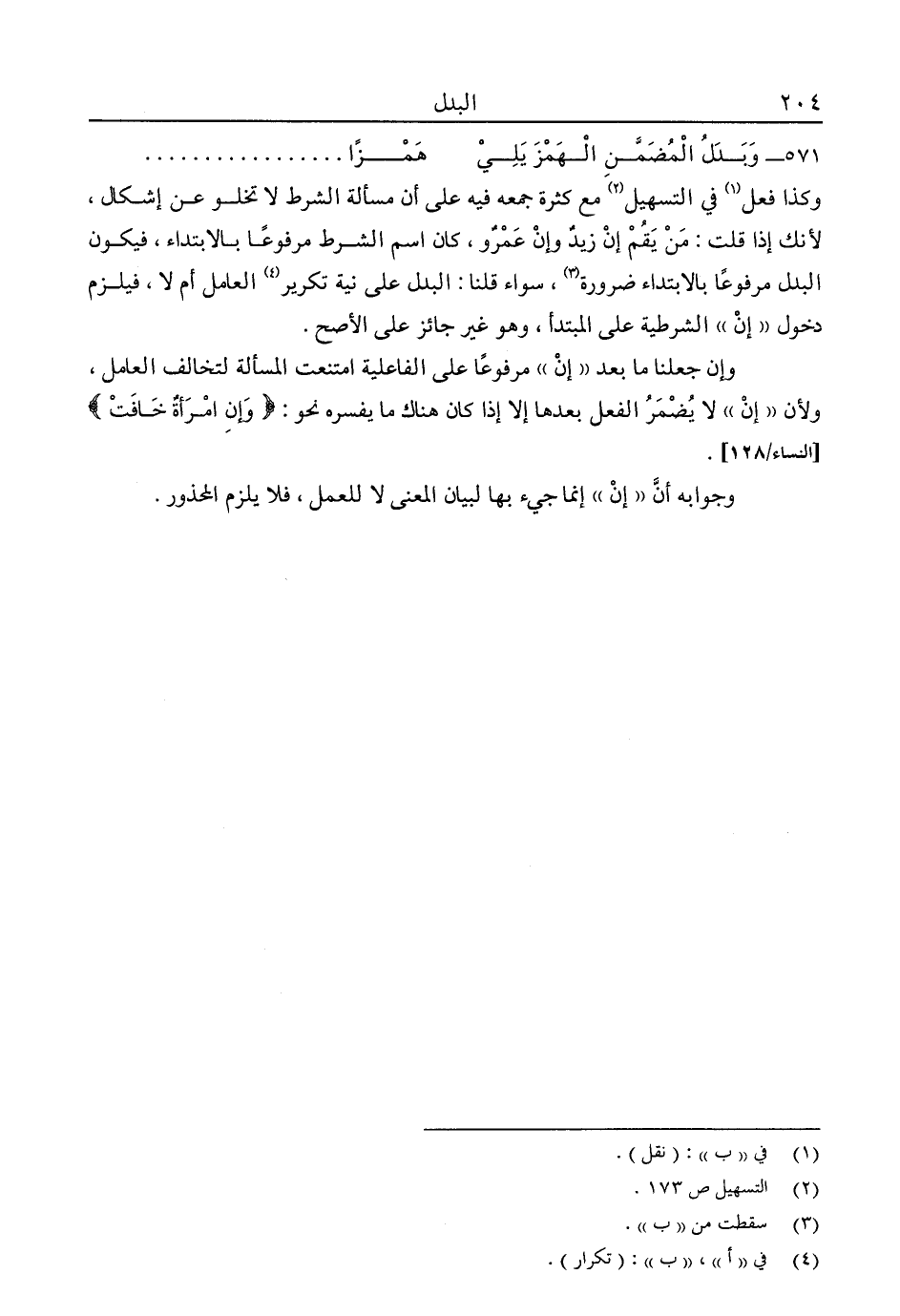 وكذا فعل1 في التسهيل2 مع كثرة جمعه فيه على أن مسألة الشرط لا تخلو عن إشكال، لأنك إذا قلت: من يقم إن زيد وإن عمرو، كأن اسم الشرط، مرفوعًا بالابتداء، فيكون البدل مرفوعًا، بالابتداء ضرورة3، سواء قلنا: البدل على نية تكرير4 العامل أم لا، فيلزم دخول "إن" الشرطية على المبتدأ، وهو غير جائز على الأصح.