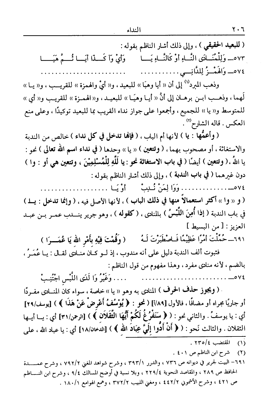 "ويجوز حذف الحرف" المنادى به وهو "يا" خاصة، سواء كان المنادى مفردًا أو جاريًا مجراه أو مضافًا، فالأول "نحو: {يُوسُفُ أَعْرِضْ عَنْ هَذَا} " [يوسف: 29] أي: يا يوسف. والثاني نحو: " {سَنَفْرُغُ لَكُمْ أَيُّهَا الثَّقَلَانِ} " [الرحمن: 31] أي: يا أيها الثقلان. والثالث نحو: " {أَنْ أَدُّوا إِلَيَّ عِبَادَ اللَّهِ} " [الدخان: 18] أي: يا عباد الله، على