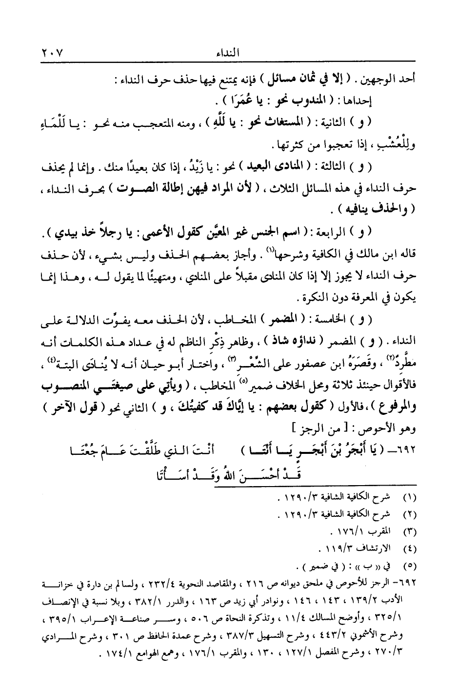 "و" الخامسة: "المضمر" المخاطب، لأن الحذف معه يفوت الدلالة على النداء. "و" المضمر "نداؤه شاذ"، وظاهر ذكر الناظم له في عداد هذه الكلمات أنه مطرد2، وقصره ابن عصفور على الشعر3، واختار أبو حيان أنه لا ينادى البتة4، فالأقوال حينئذ ثلاثة ومحل الخلاف ضمير5 المخاطب، "ويأتي على صيغتي المنصوب والمرفوع"، فالأول "كقول بعضهم: يا إياك قد كفيتك، و" الثاني نحو "قول الآخر" وهو الأحوص: [من الرجز]