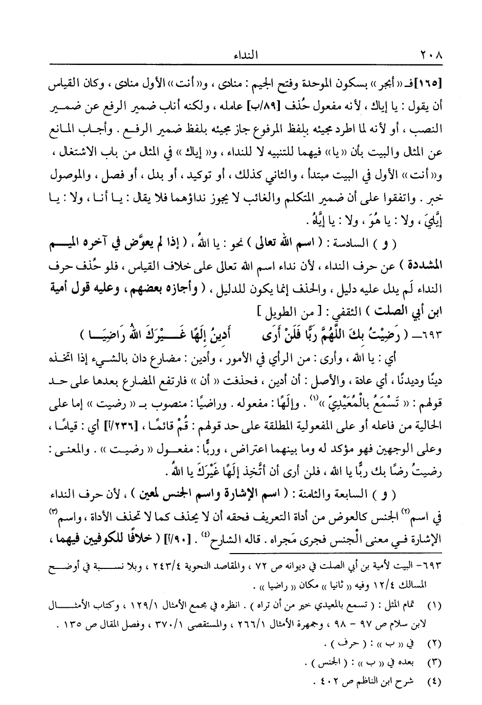فـ"أبجر" بسكون الموحدة وفتح الجيم: منادى، و"أنت" الأول منادى، وكان القياس أن يقول: يا إياك، لأنه مفعول حذف عامله، ولكنه أناب ضمير الرفع عن ضمير النصب، أو لأنه لما اطرد مجيئه بلفظ المرفوع جاز مجيئه بلفظ ضمير الرفع. وأجاب المانع عن المثال والبيت بأن "يا" فيهما للتنبيه لا للنداء، و"إياك" في المثال من باب الاشتغال، و"أنت" الأول في البيت مبتدأ، والثاني كذلك، أو توكيد، أو بدل، أو فصل، والموصول خبر. واتفقوا على أن ضمير المتكلم والغائب لا يجوز نداؤهما فلا يقال: يا أنا، ولا: يا إياي، ولا: يا هو، ولا: يا إياه.